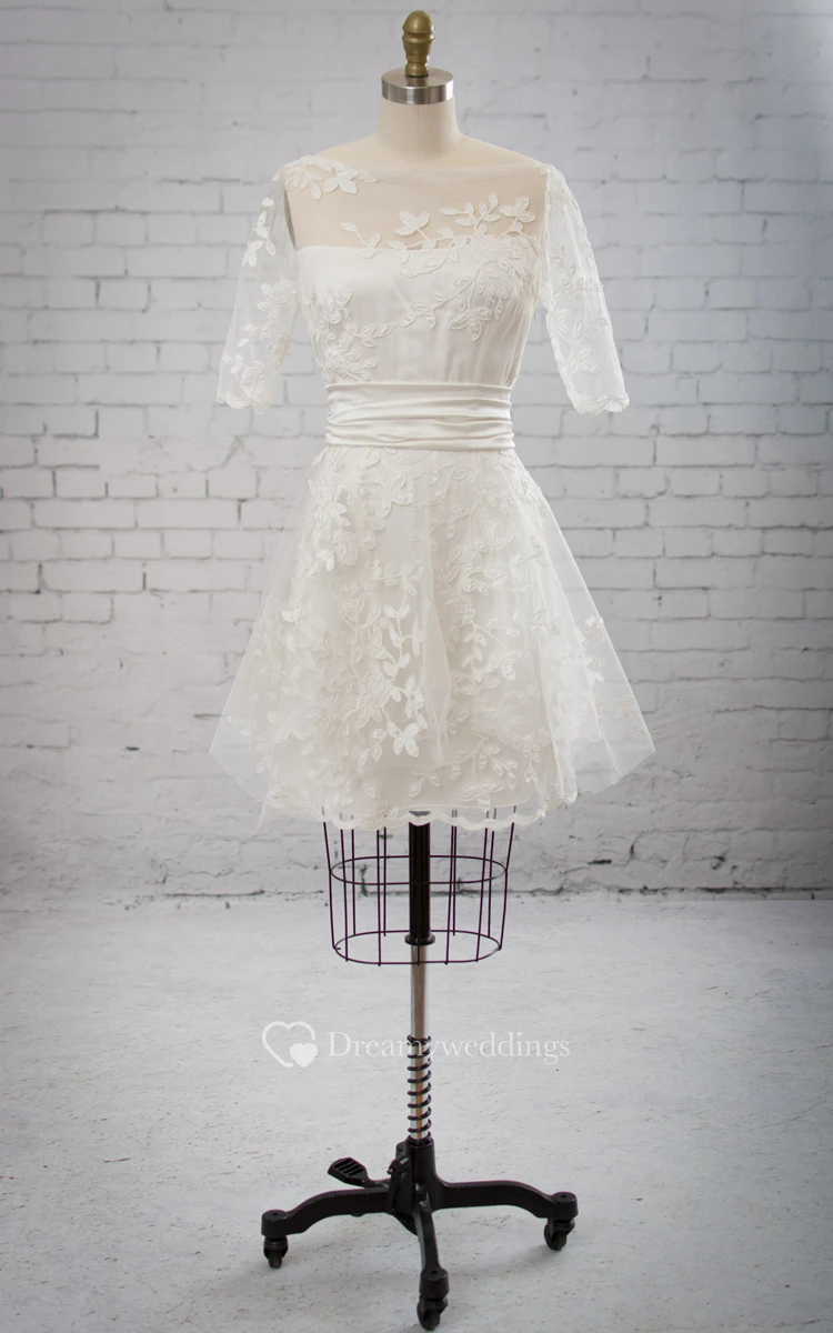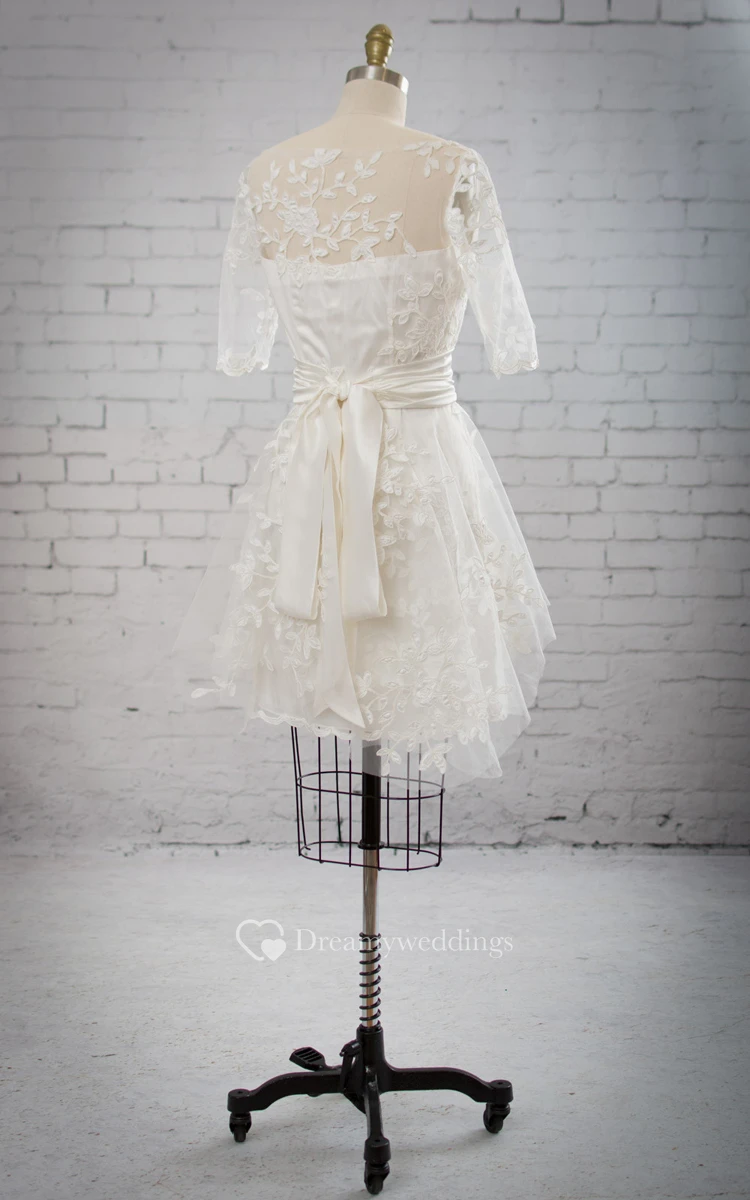 Illusion Half-Sleeved Tulle Mini Dress With Appliques And Bandage