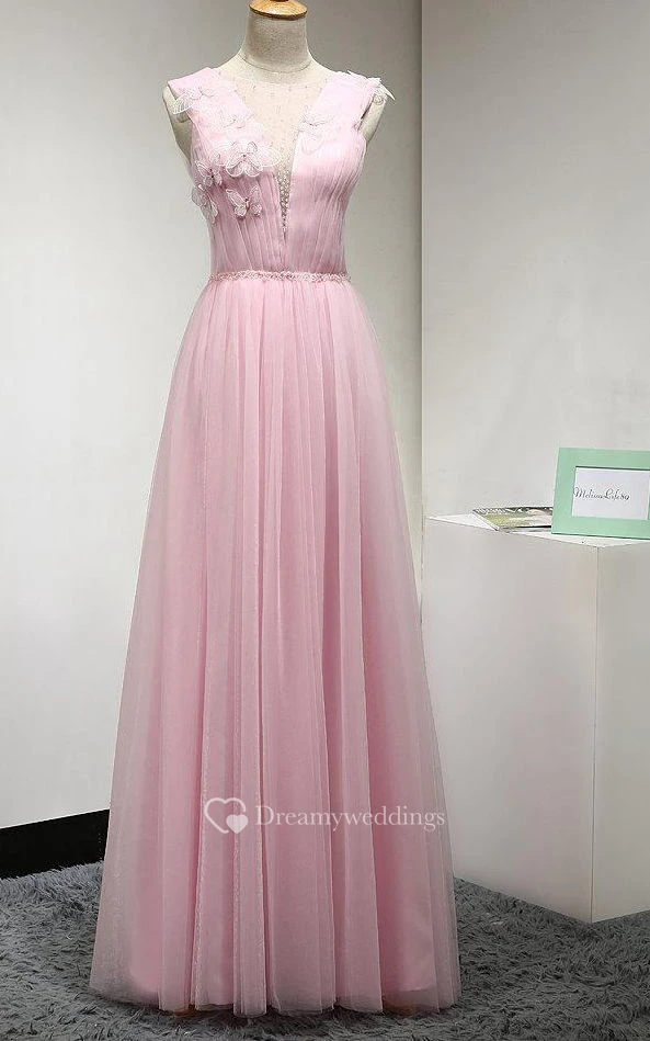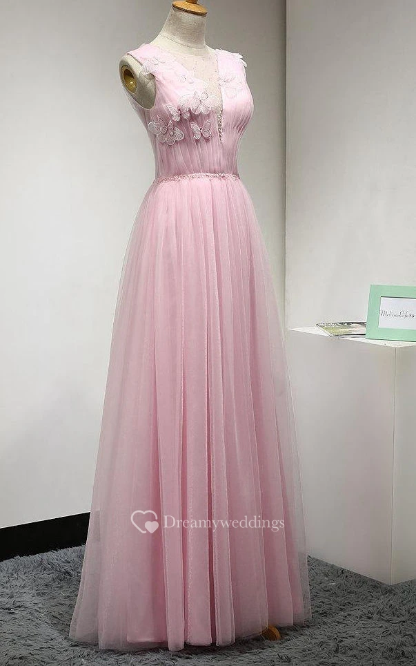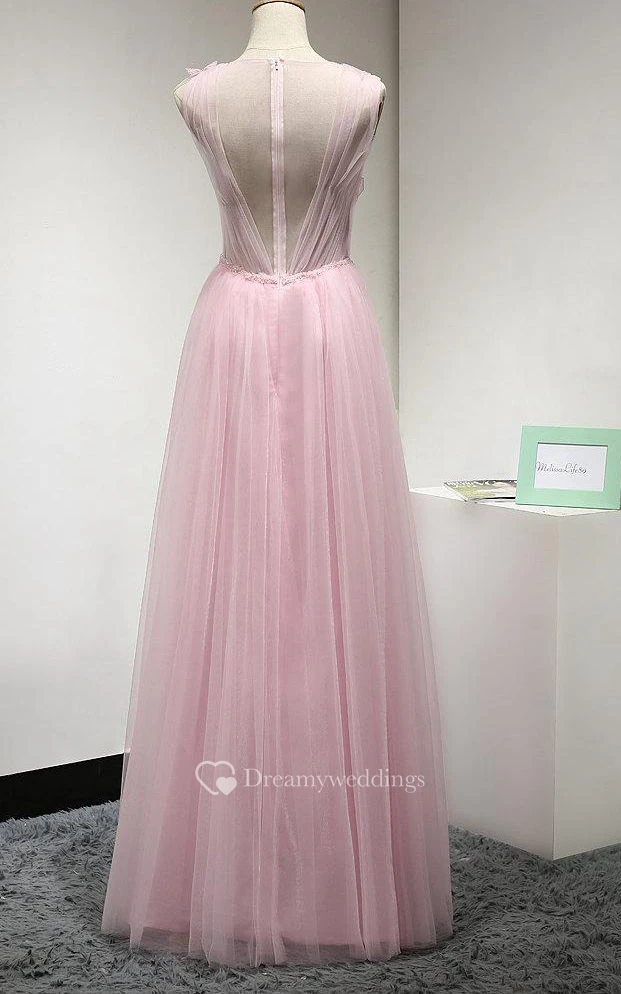 Illusion Jewel Neckline Pleated A-line Tulle Floor Length Dress With Flowers