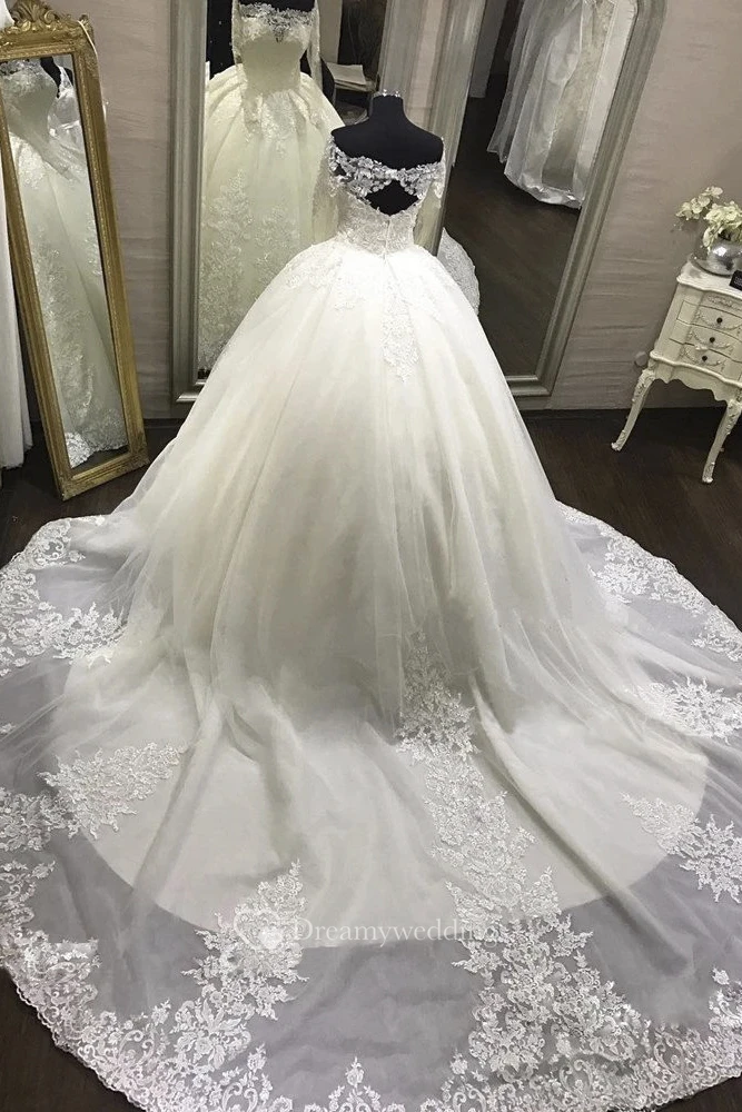 Illusion Lace Long Sleeve Luxury Off-the-shoulder Ballgown Wedding Dress With Keyhole Back