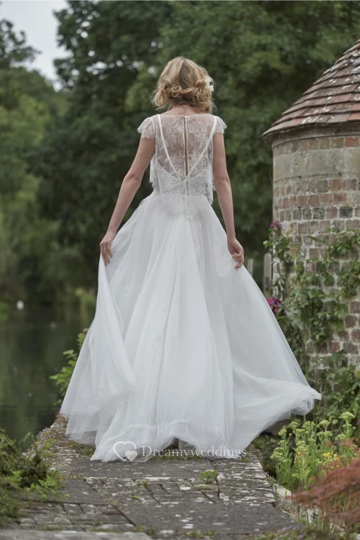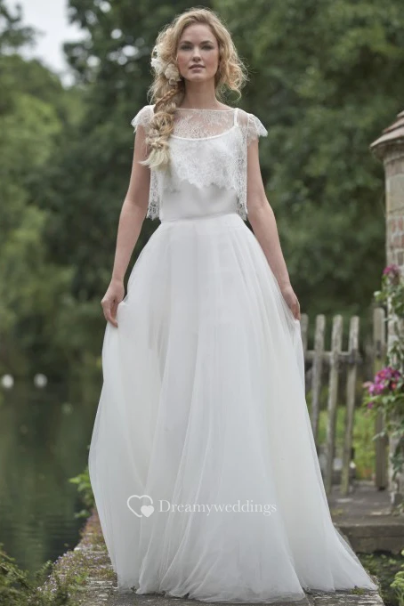Jewel Floor-Length Cap-Sleeve Lace Tulle Wedding Dress With Illusion