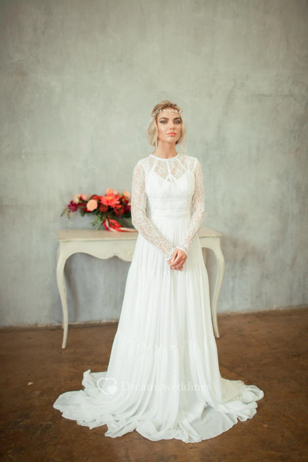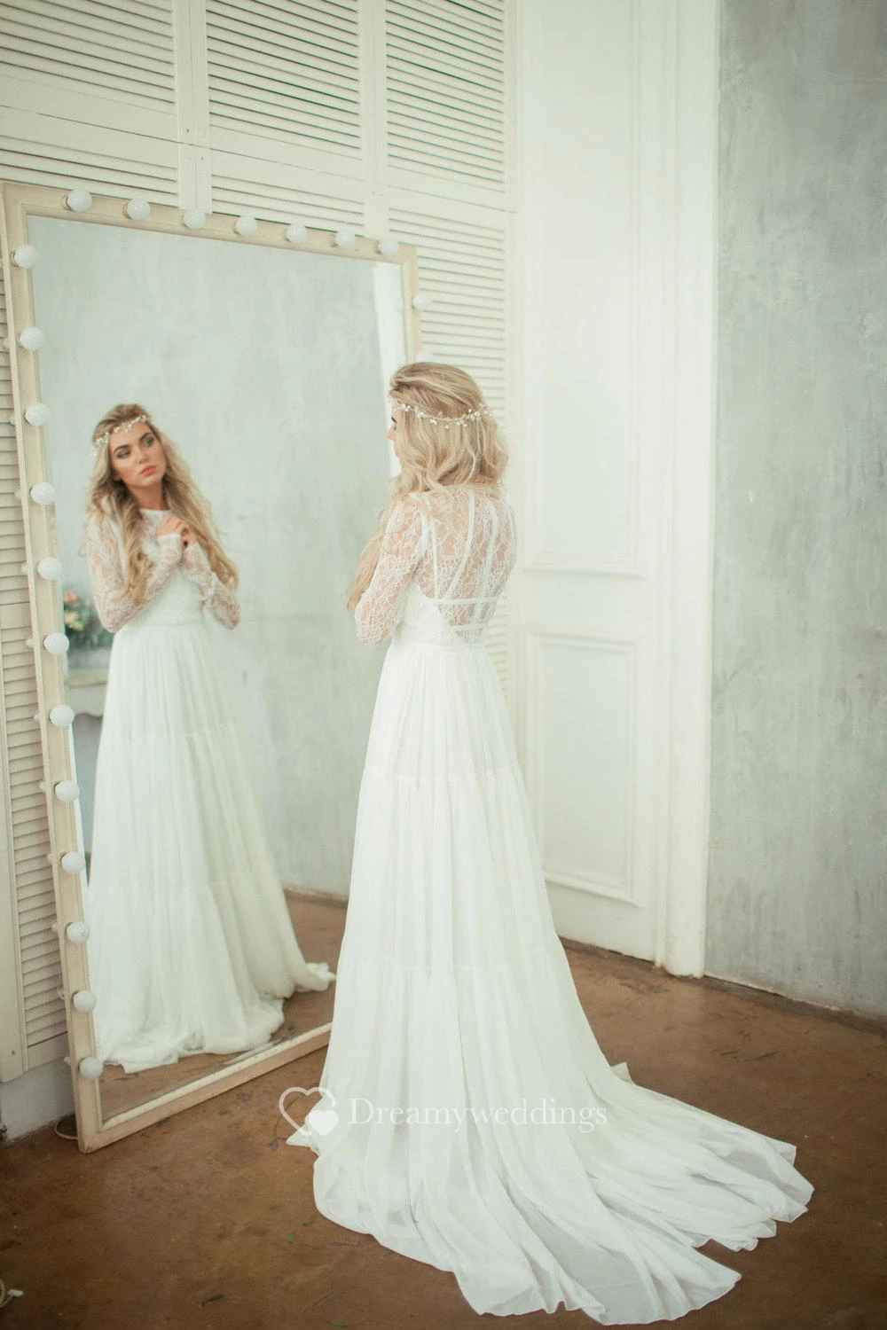 Jewel Neck Long Sleeve A-Line Lace and Chiffon Dress With Illusion Back