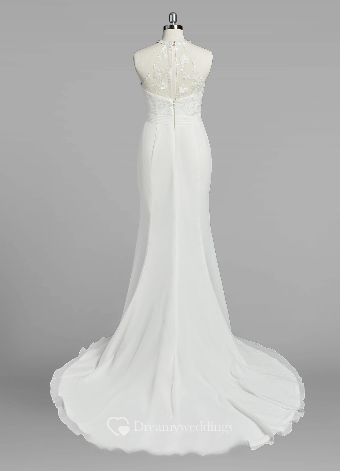 Jewel Neck Mermaid Chiffon Wedding Dress With Lace Bodice
