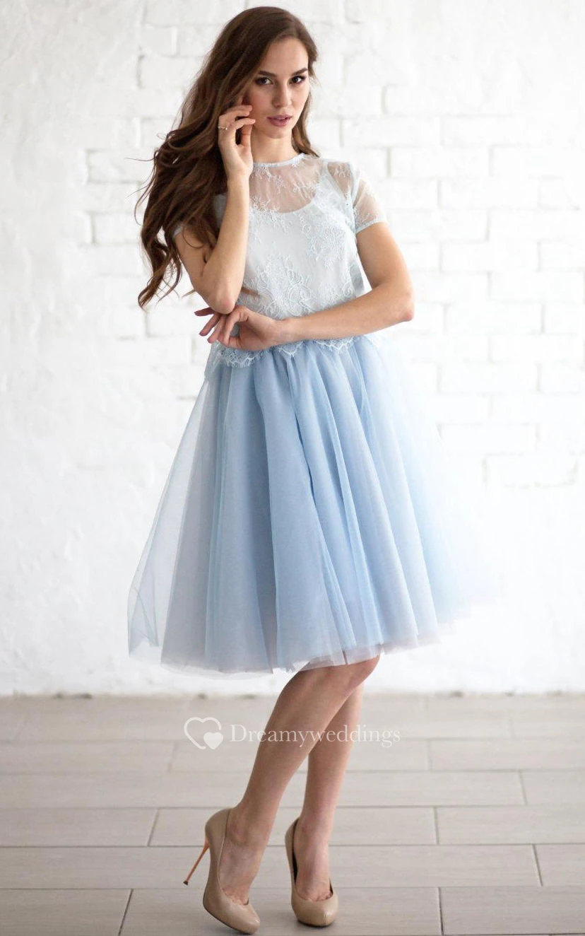 Jewel Neck Short Sleeve A-line Pleated Tulle Knee Length Dress Lace Top