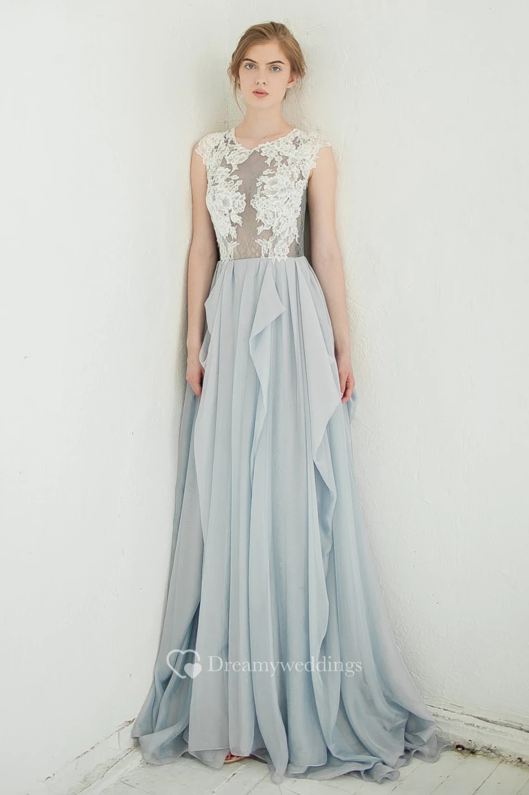 Jewel-Neck Sleeveless A-Line Chiffon Draped Dress With Lace Appliqued Top