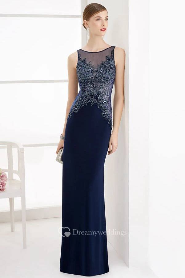Jewel Neck Sleeveless Sheath Long Prom Dress With Beaded Lace Top