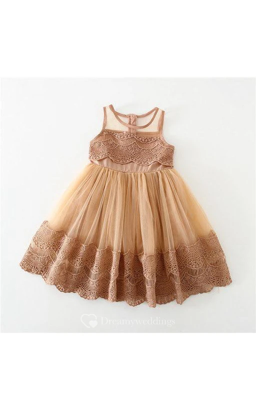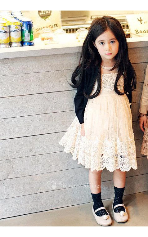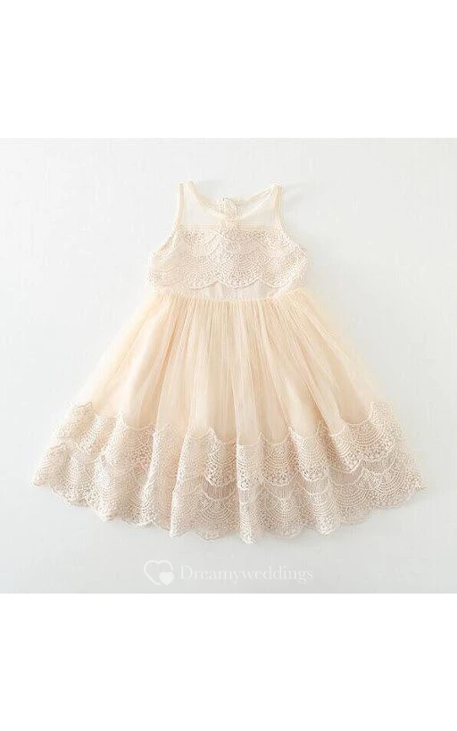 Jewel Neckline A-line Pleated Lace Knee Length Dress With Illusion Style