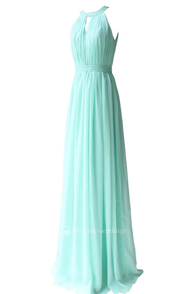 Jewel Notched Pleated Chiffon A-line Gown With Beading
