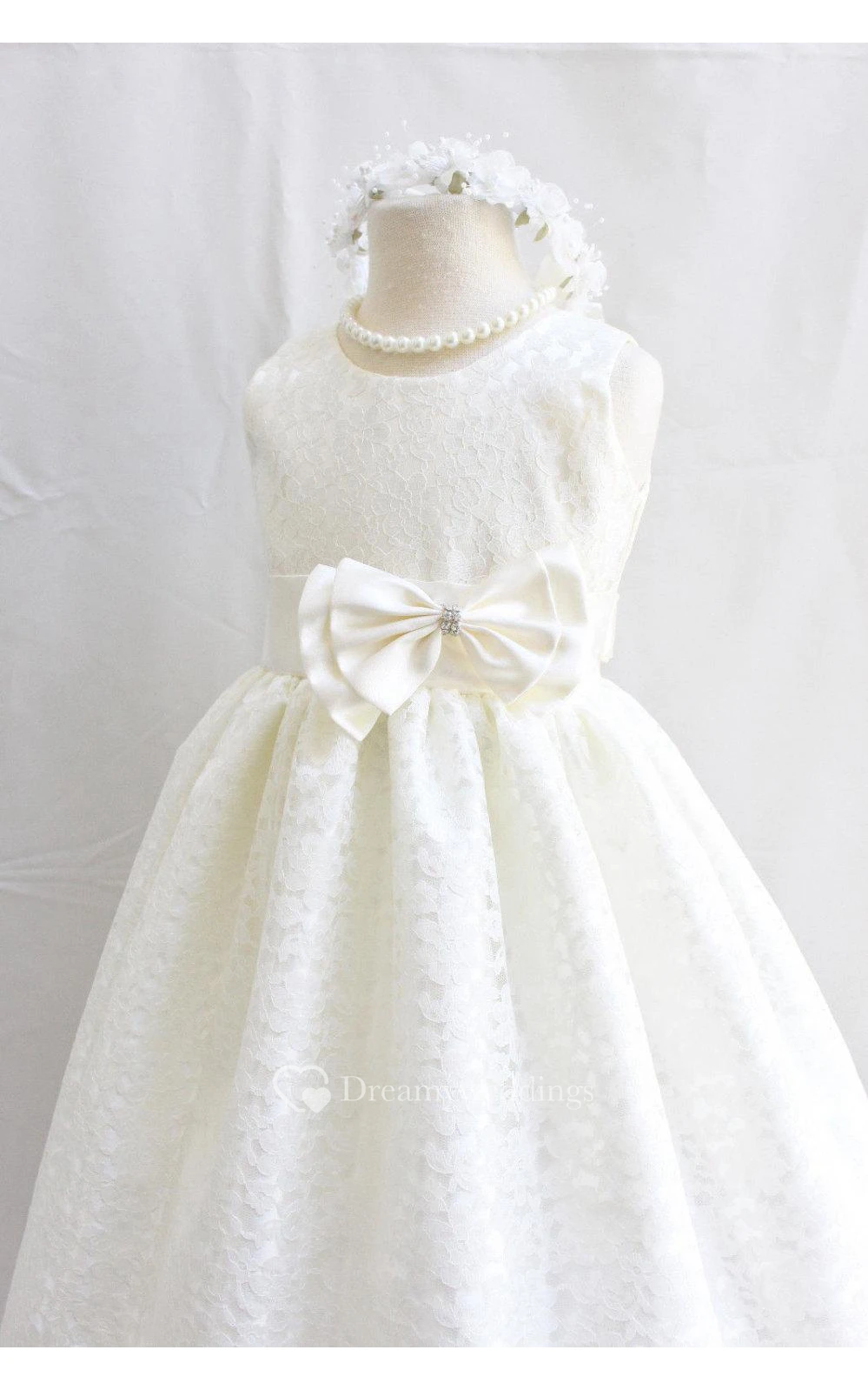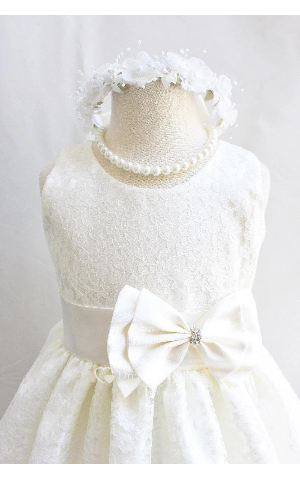 Jewel Scoop Neck Sleeveless Pleated A-line Lace Long Dress With Bow Belt
