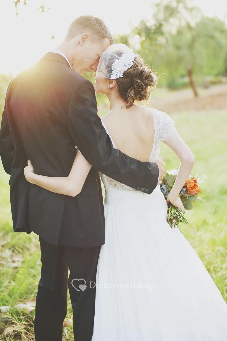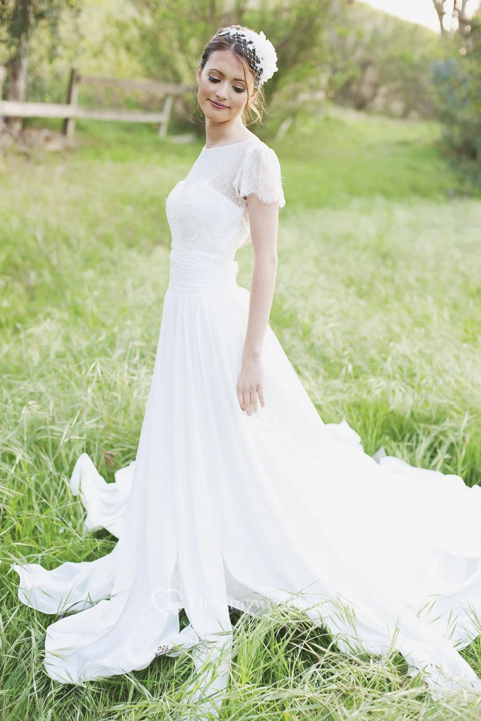 Jewel Short Sleeve Long Chiffon Wedding Dress With Sash And Low-V Back