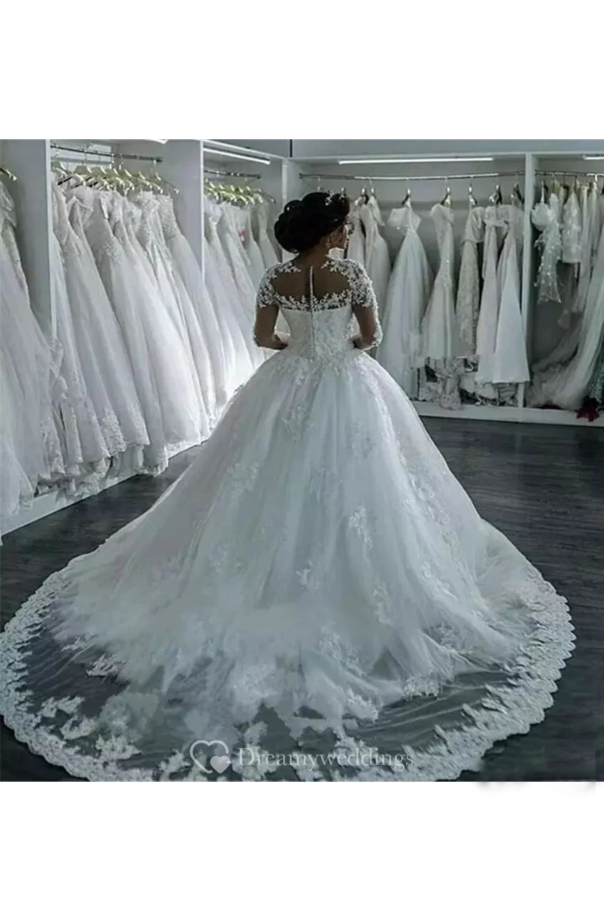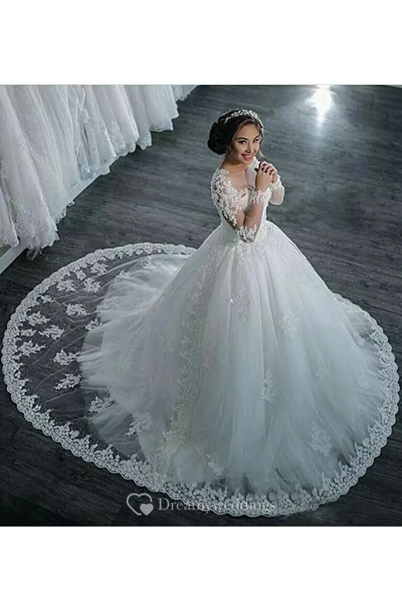 Jewel Sleeveless Court Train Lace Tulle A-Line Ball Gown Wedding Dress