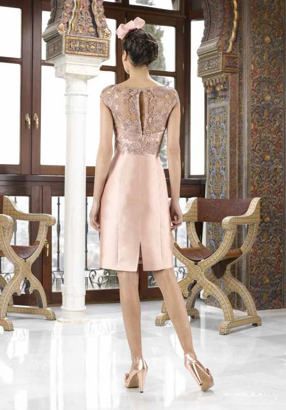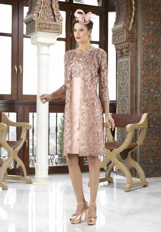 Knee-Length 3-4 Sleeve Bateau Neck Appliqued Satin Mother Of The Bride Dress