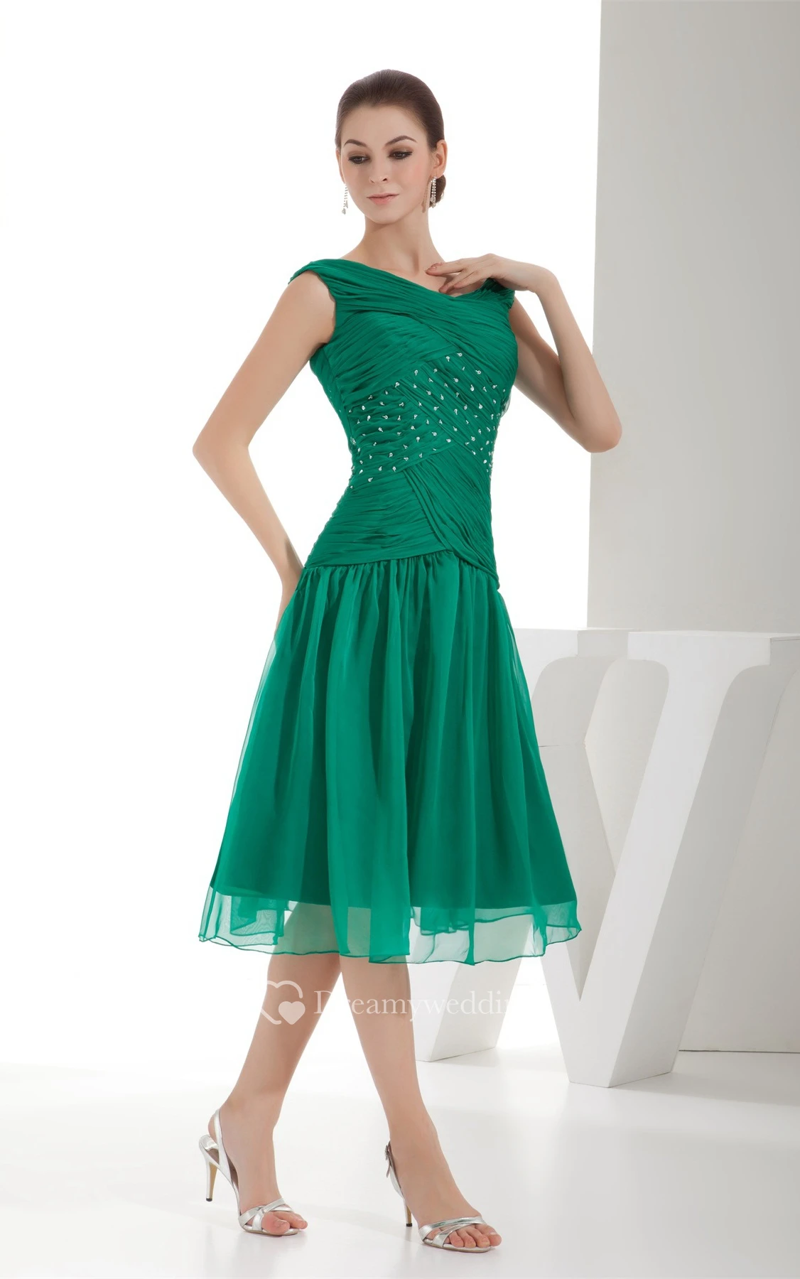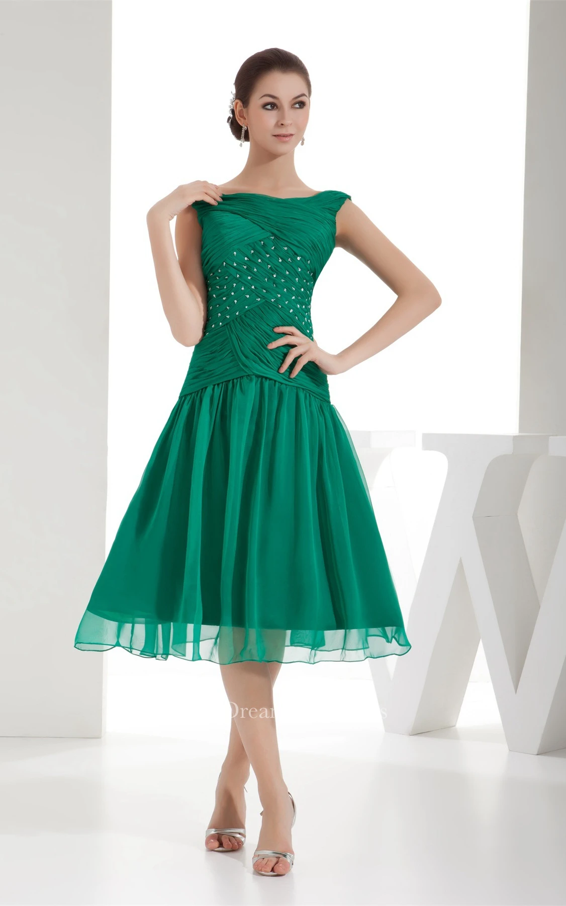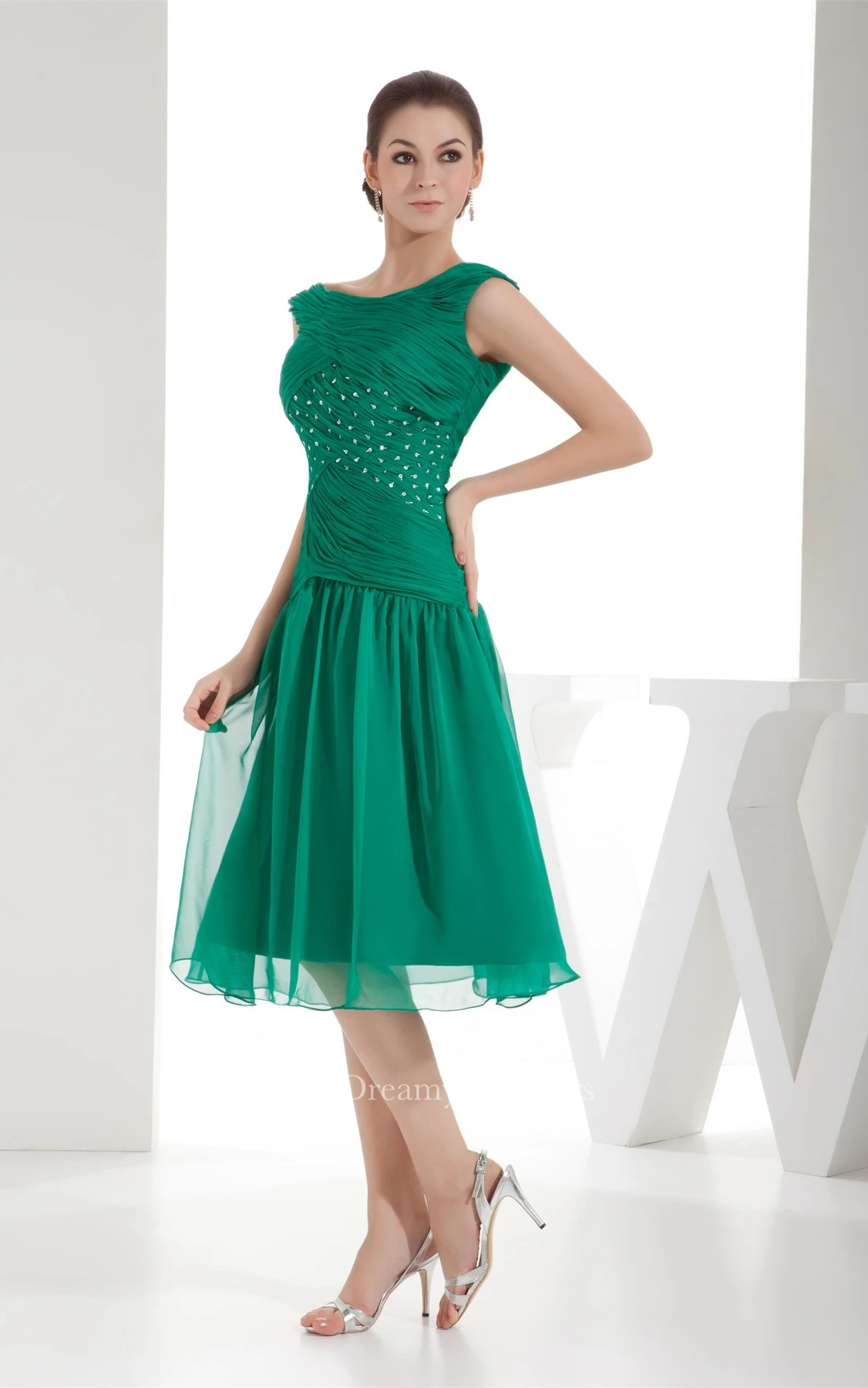 Knee Length Bateau Ruched Criss Cross Dress With Tulle Overlay and Beadings