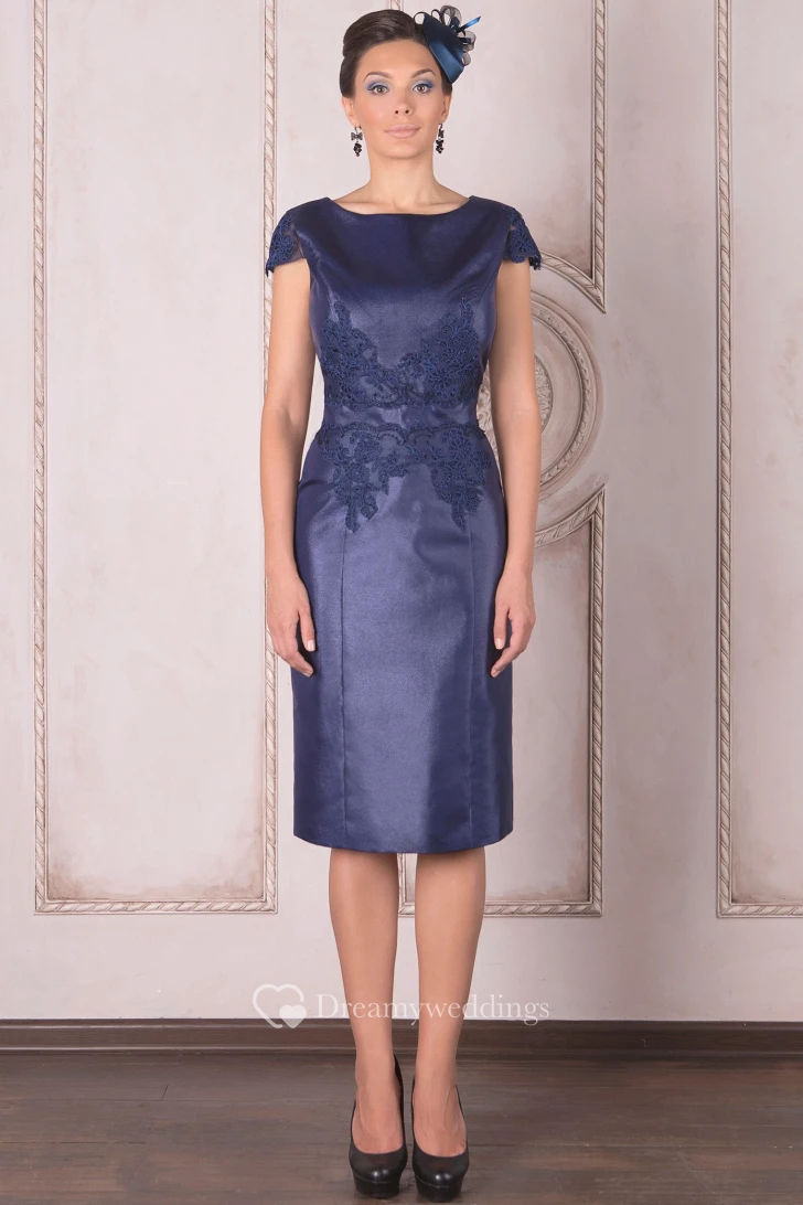 Knee-Length Pencil Cap Sleeve Appliqued Bateau Neck Satin Mother Of The Bride Dress