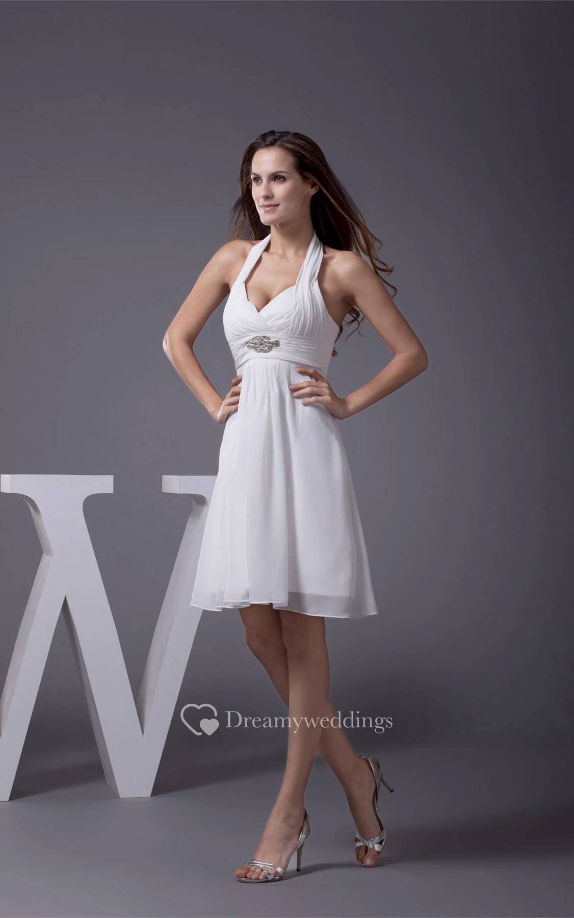 Knee Length Sleeveless Halter A-Line Dress With Ruching and Beadings