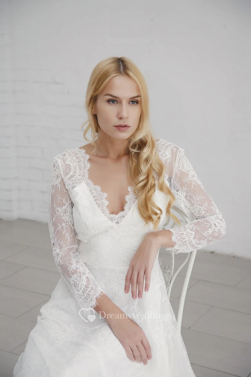 Lace A-line Long Sleeve Elegant Wedding Dress With V-neck And Deep V-back
