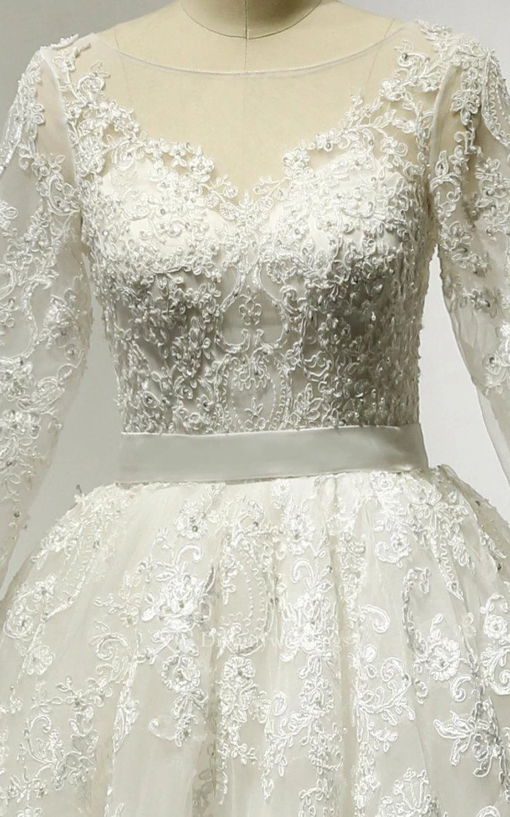 Lace and Tulle 3-4 Sleeve Bateau Neck Dress With Low-V Back