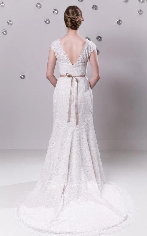 Lace Cap Sleeve High Neck Sheath Gown With Beaded Waistband