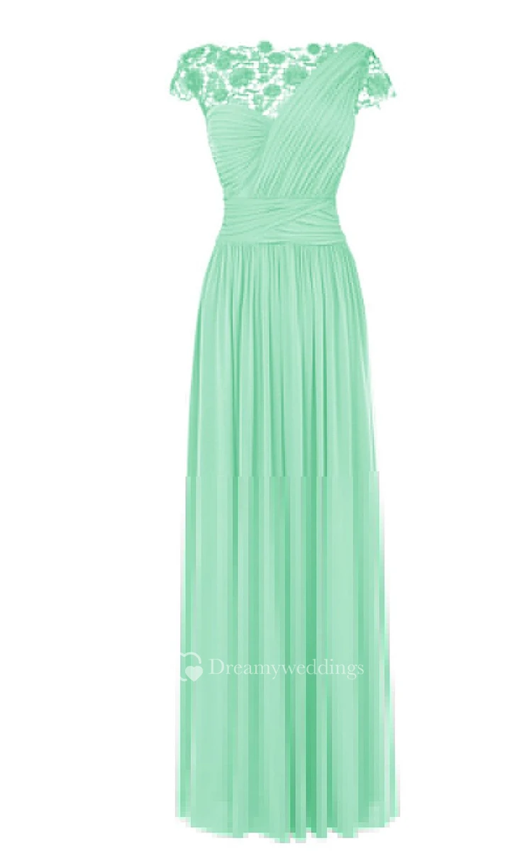 Lace Cap-sleeve One-shoulder Pleated Chiffon A-line Dress