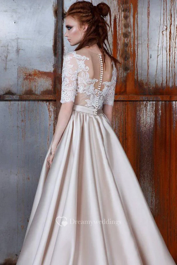 Lace Half Sleeve Satin A-Line Wedding Dress With Illusion Appliqued Top