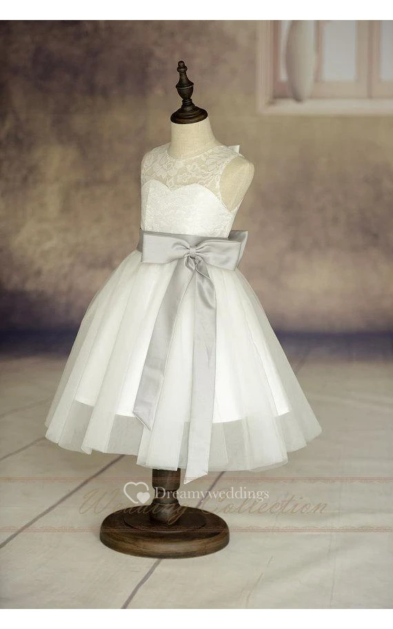 Lace Illusion Neck Sleeveless Tulle Ball Gown With Satin Bow and Sash