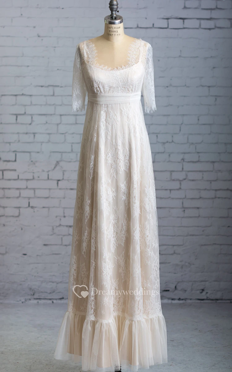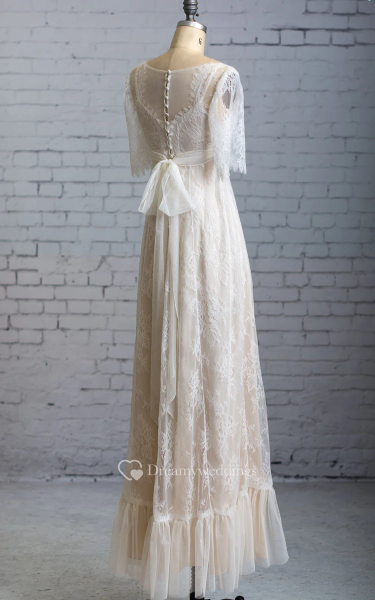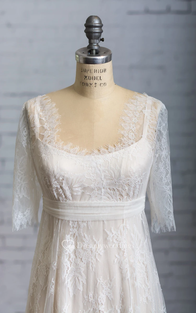 Lace Long Square-Neck Half-Illusion-Sleeved Dress With Bow