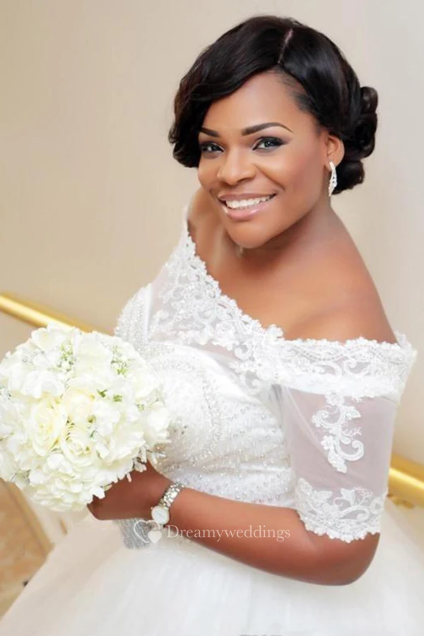 Lace Off Shoulder Sheer Half Sleeves Beaded Lace Up Plus Size Bridal Gown
