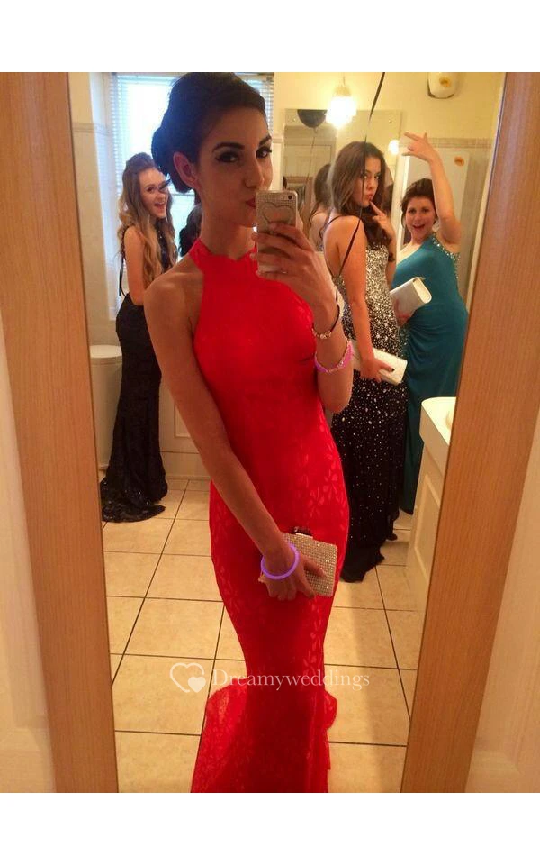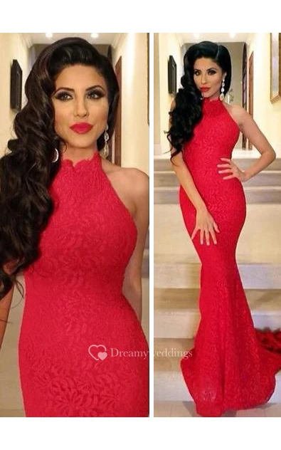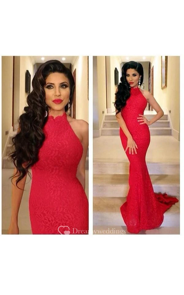 Lace Sexy Mermaid Prom Dress Red High-neck Sleeveless Evening Gowns
