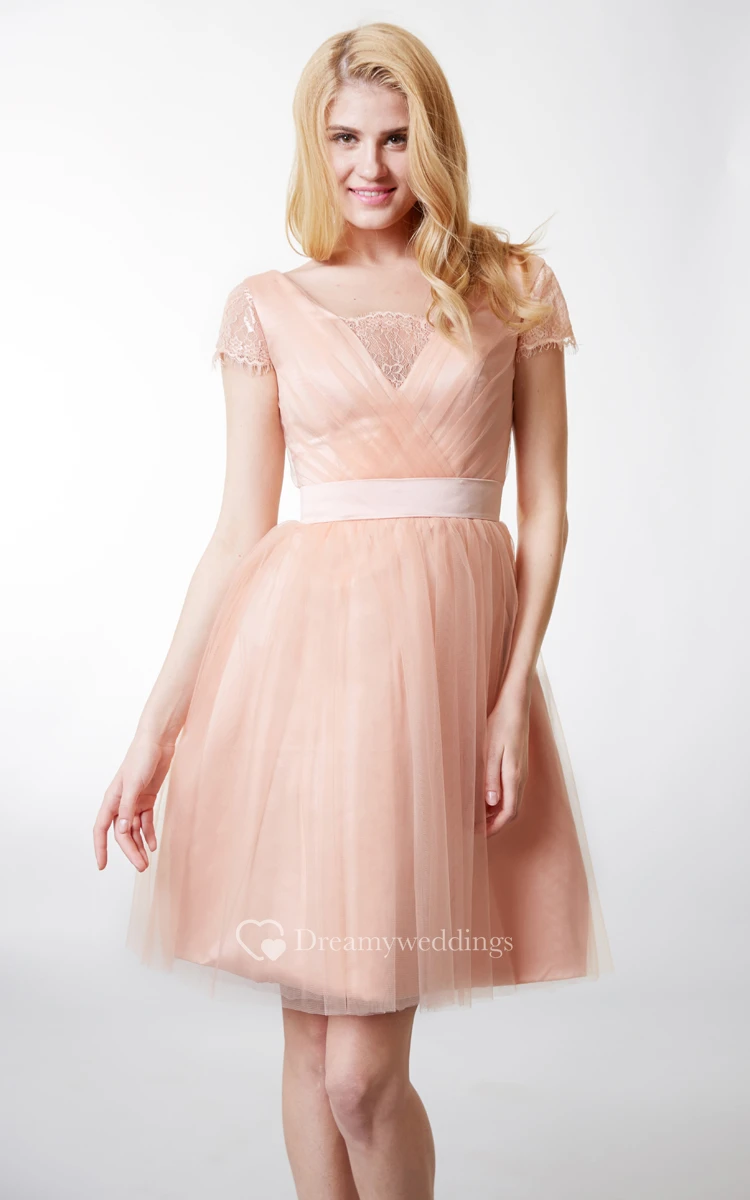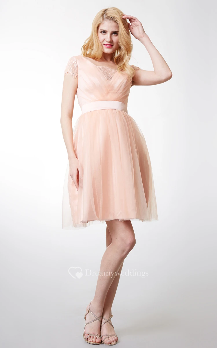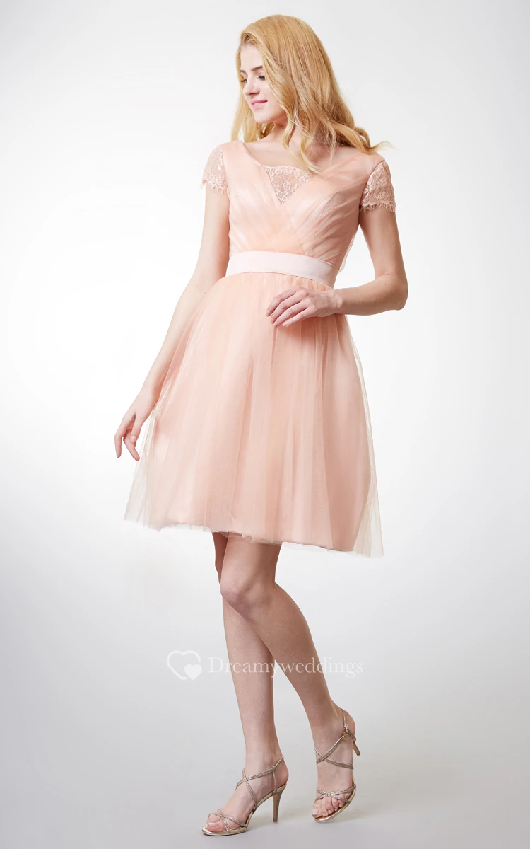 Lace Short Sleeve Pleated Tulle Dress With Satin Belt