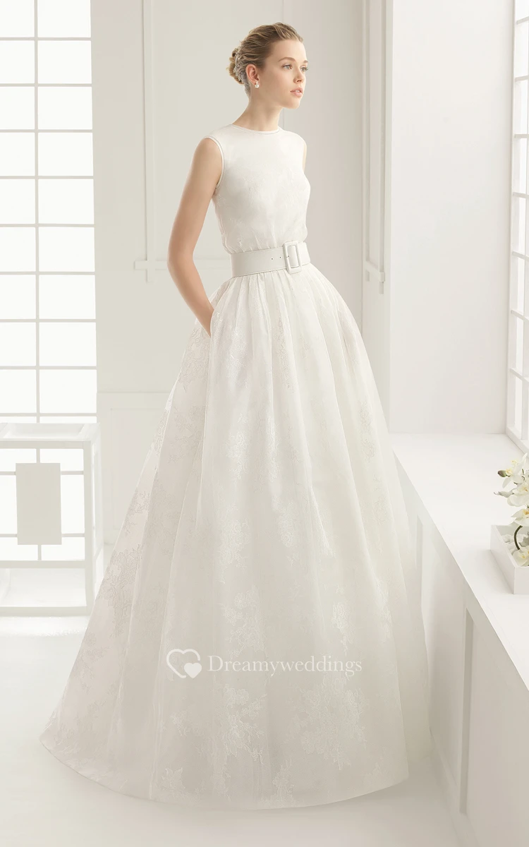 Lace Sleeveless Jewel-Neck Gown With Wide Belt