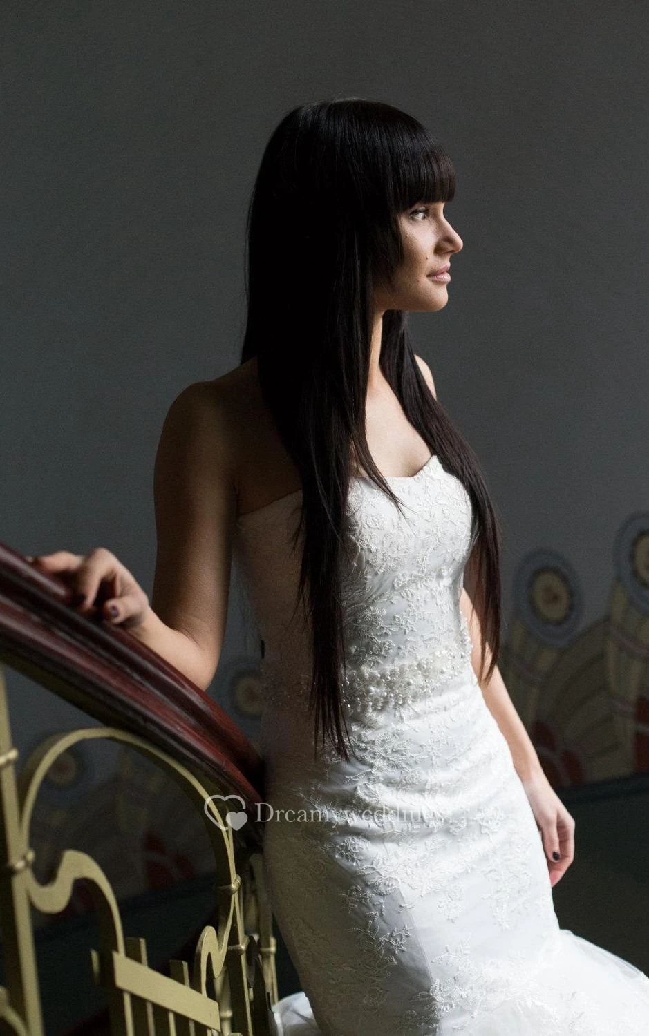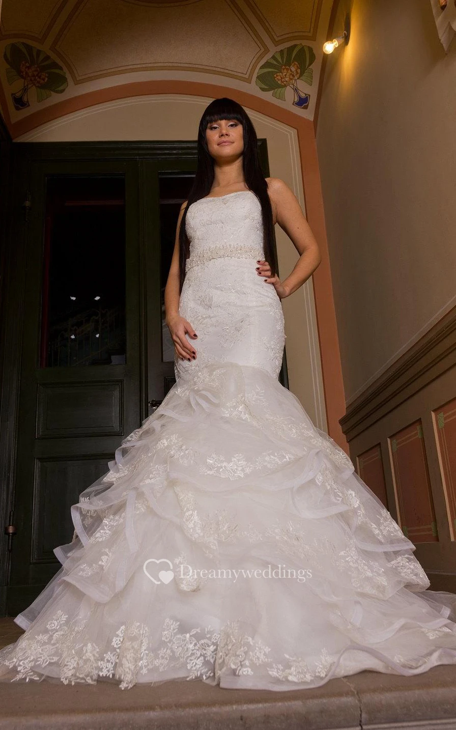Lace Strapless Mermaid Gown With Layered Skirt and Beaded Waist