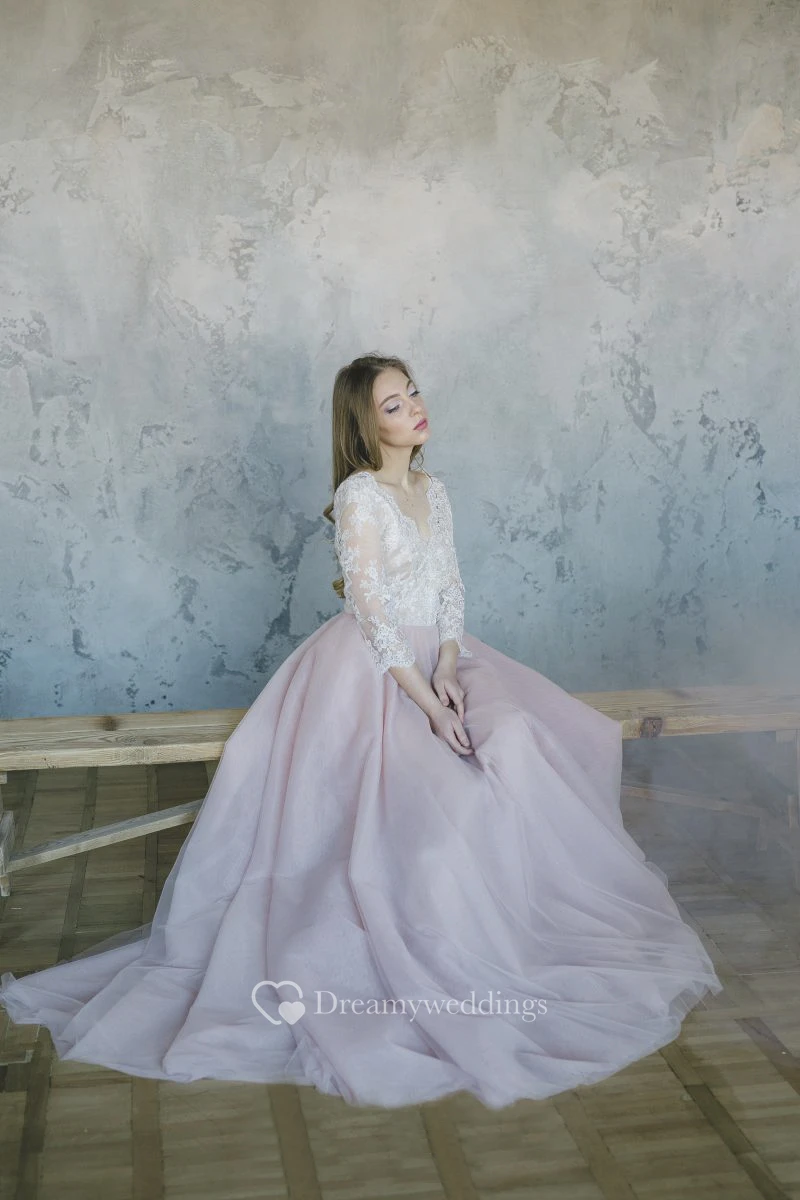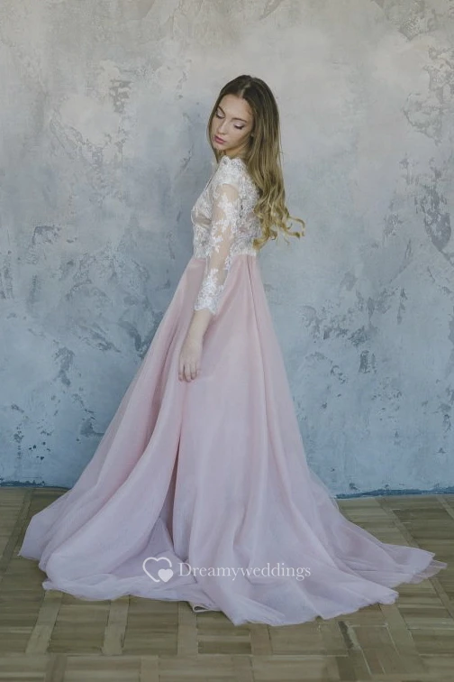 Lace Tulle Wedding Gown With V-neck And 3/4 Sleeve