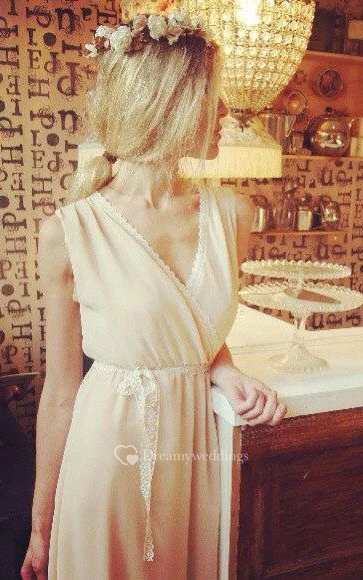 Lace V Neck Pleated A-line Chiffon Long Dress With Lace Sash