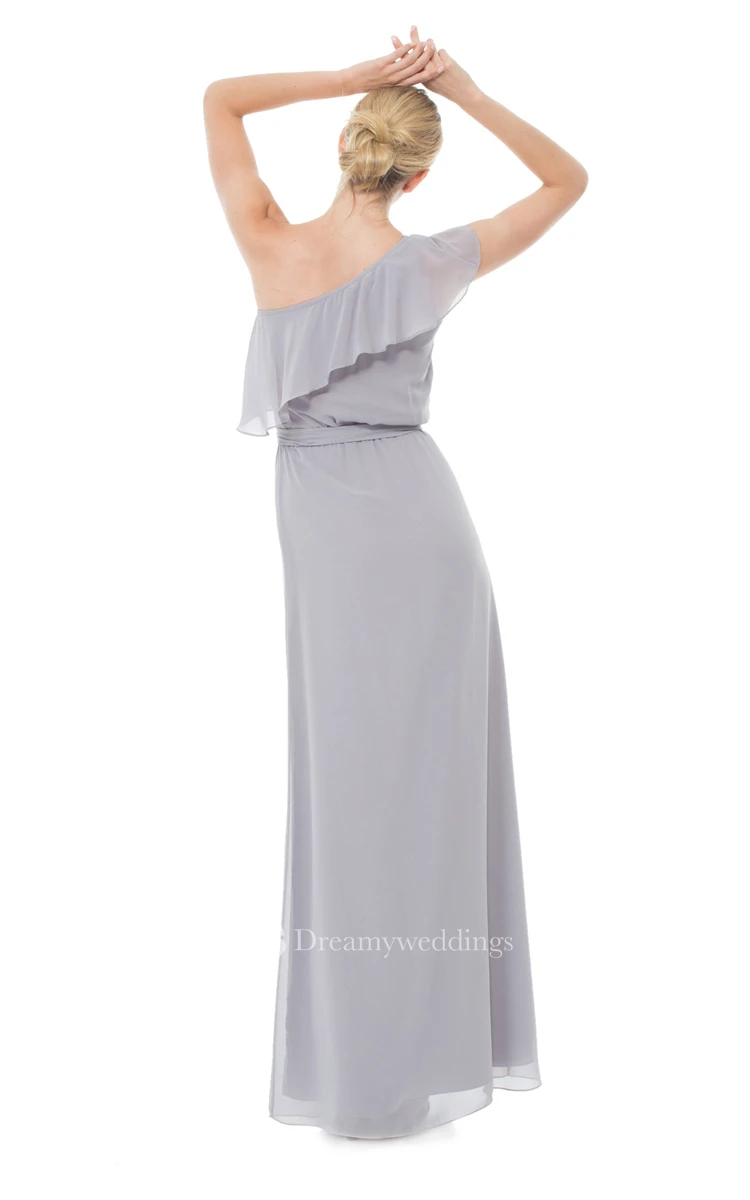 Long-Chiffon One-Shoulder Dress With Bow Sash And Ruffles