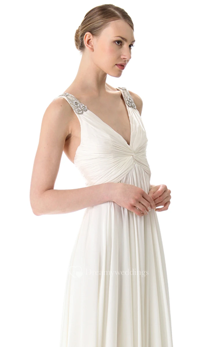Long Deep-V Neckline Empire Chiffon Dress With Broad Straps