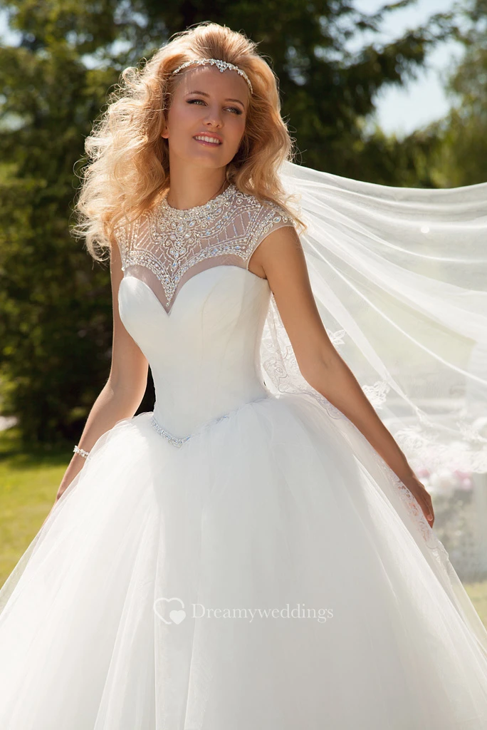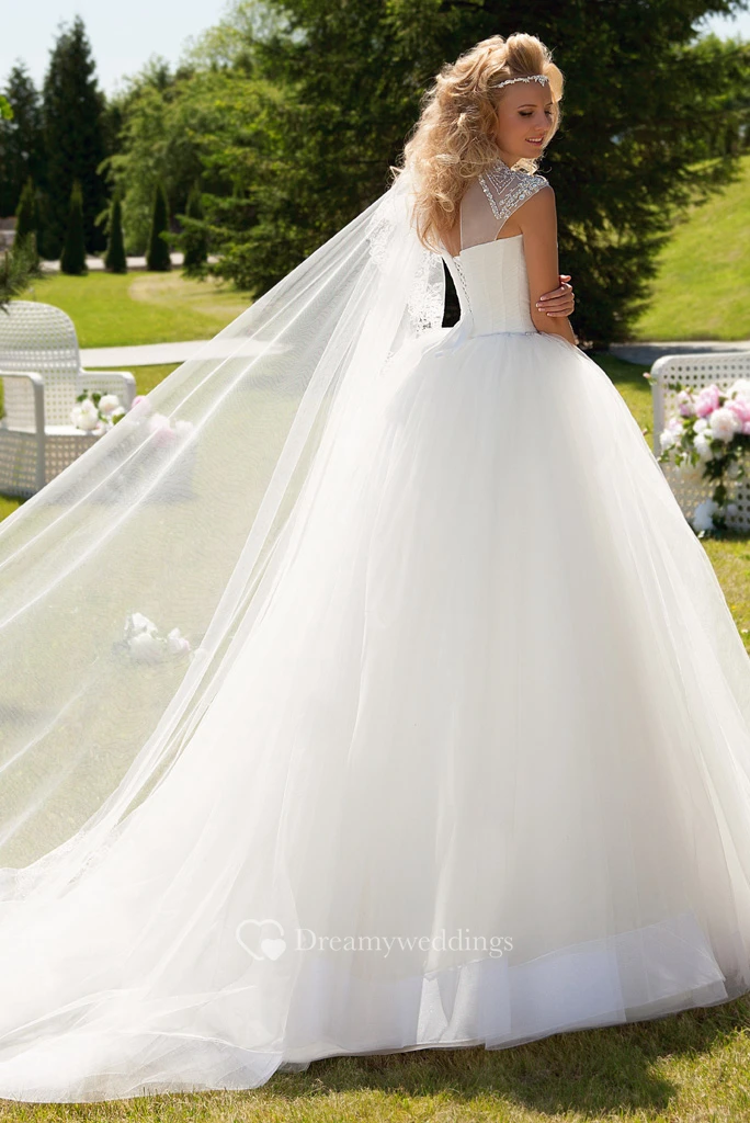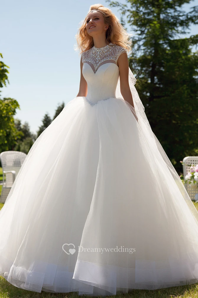 Long High Neck Beaded Cap-Sleeve Tulle Wedding Dress