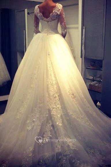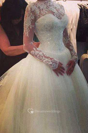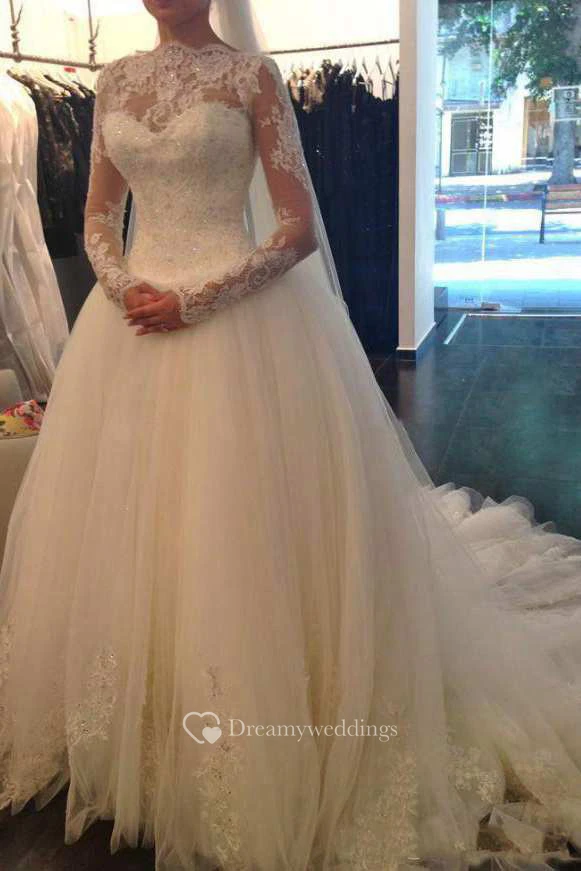 Long Illusion Sleeve High Neck A-line Tulle Dress