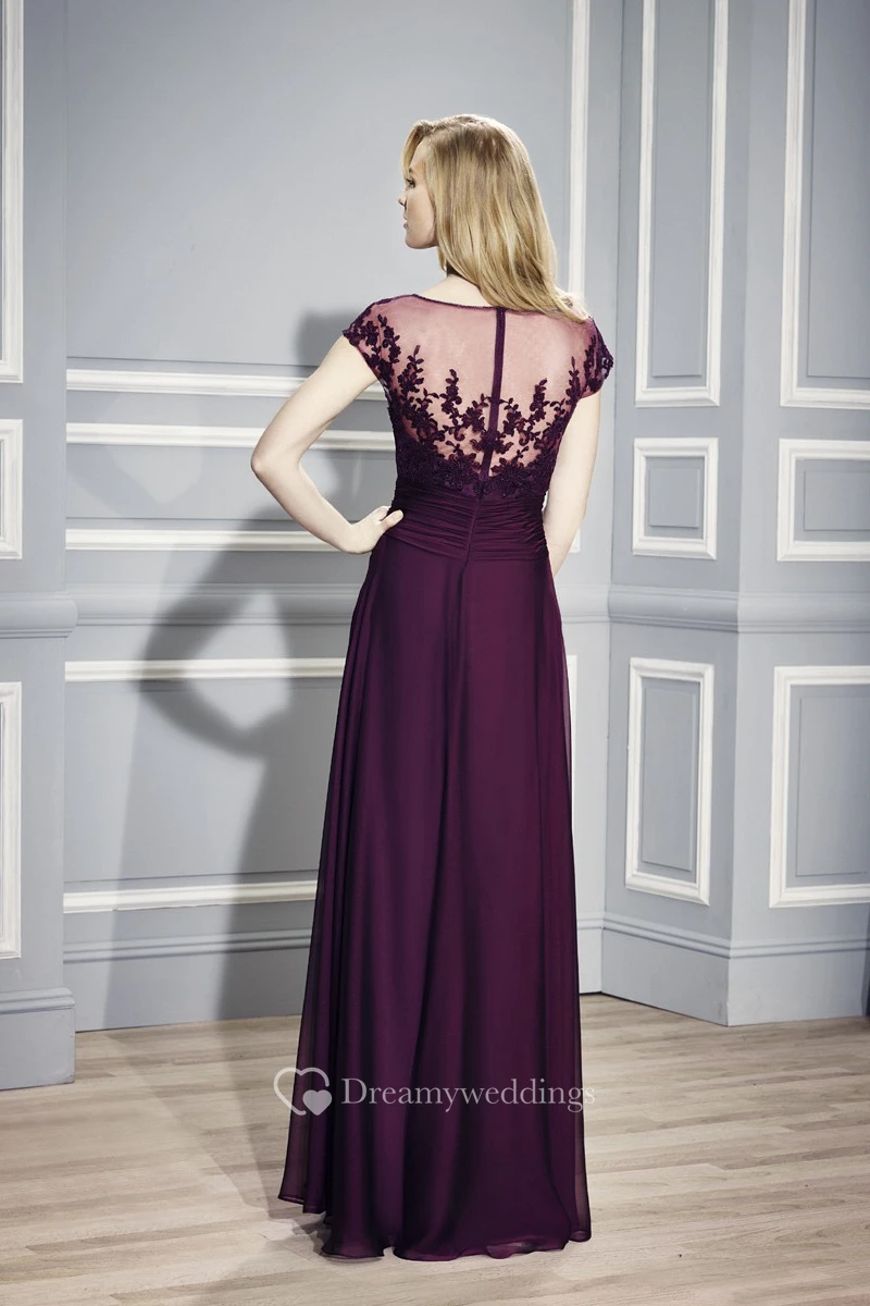 Long Scoop-Neck Cap-Sleeve Appliqued Chiffon Formal Dress