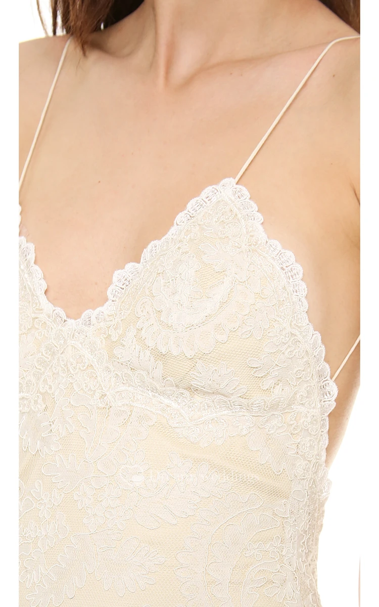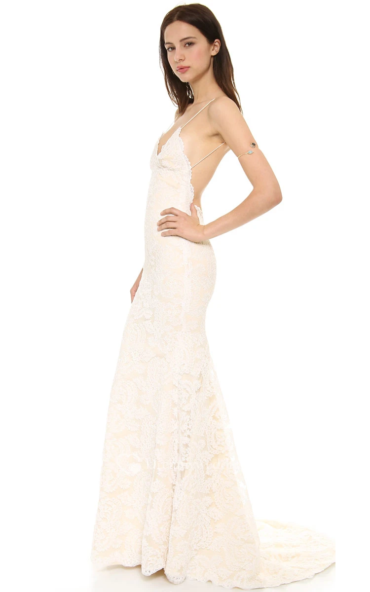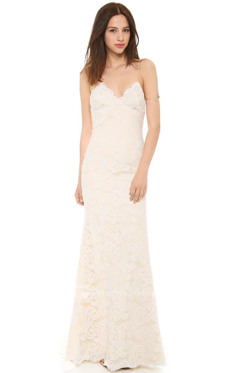 Long Sheath Lace Dress With Deep-V Back Style and Spaghetti Straps