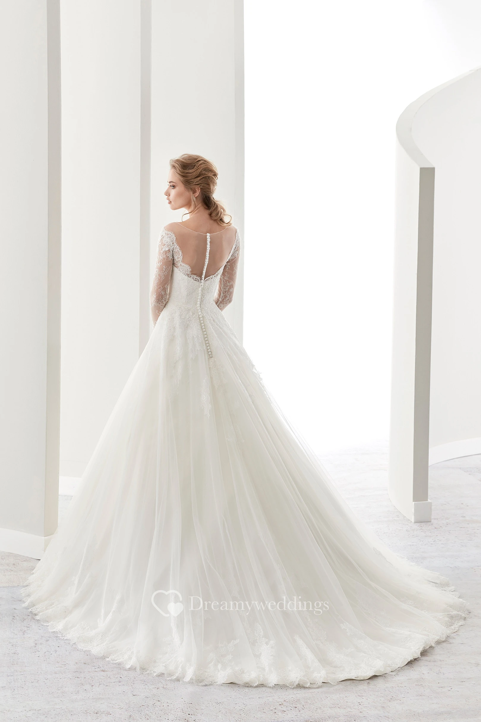 Long-Sleeve A-Line Bridal Gown With Brush Train And Illusive Design