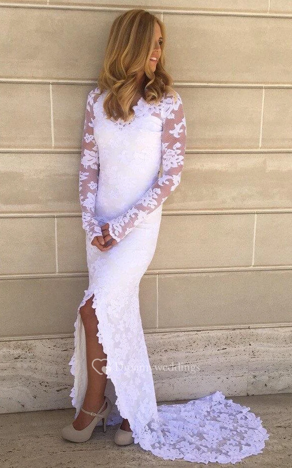 Long Sleeve Chapel Train Lace Dress With Appliques Flower