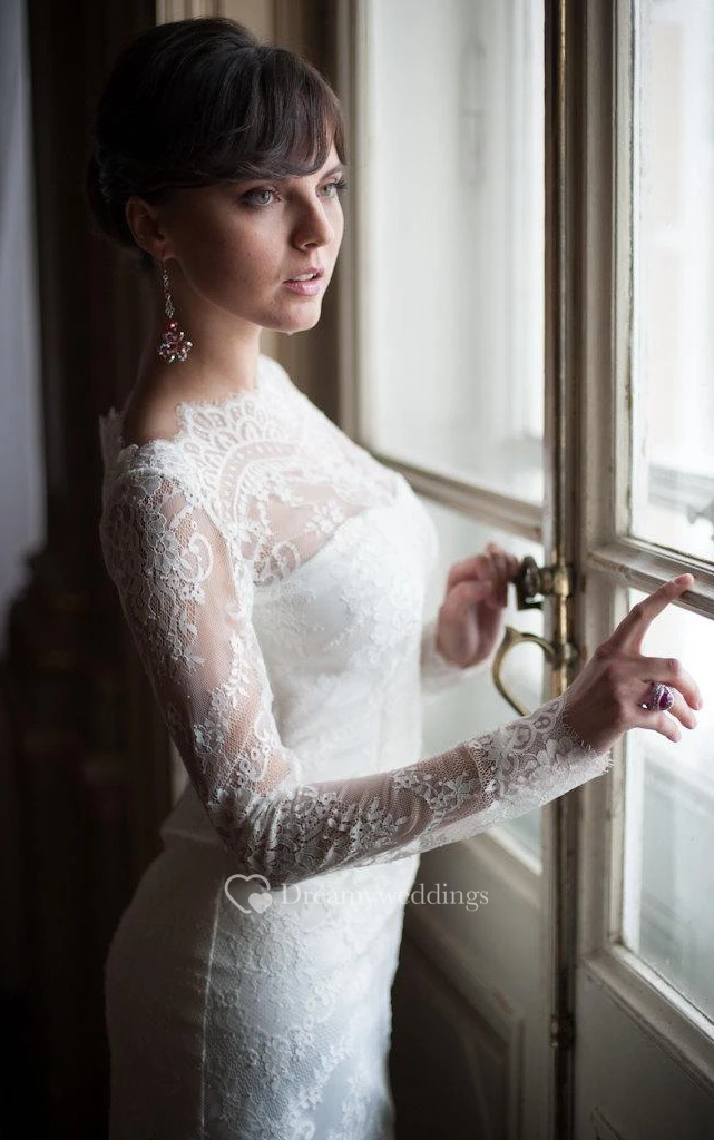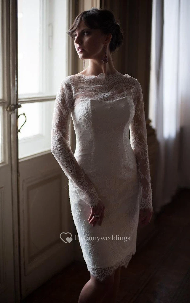 Long Sleeve High Neck Sheath Lace Knee Length Dress With Illusion Style