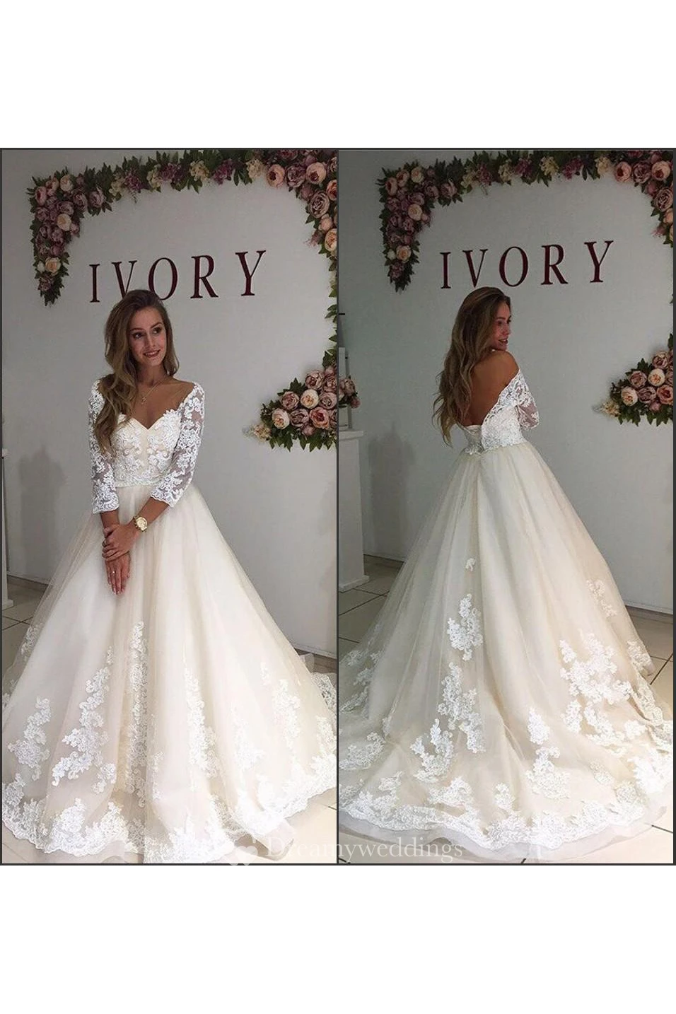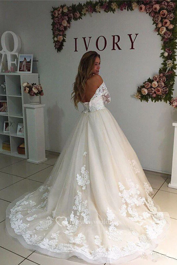 Long Sleeve Off the Shoulder V Neck A Line with Appliques Bridal Gowns
