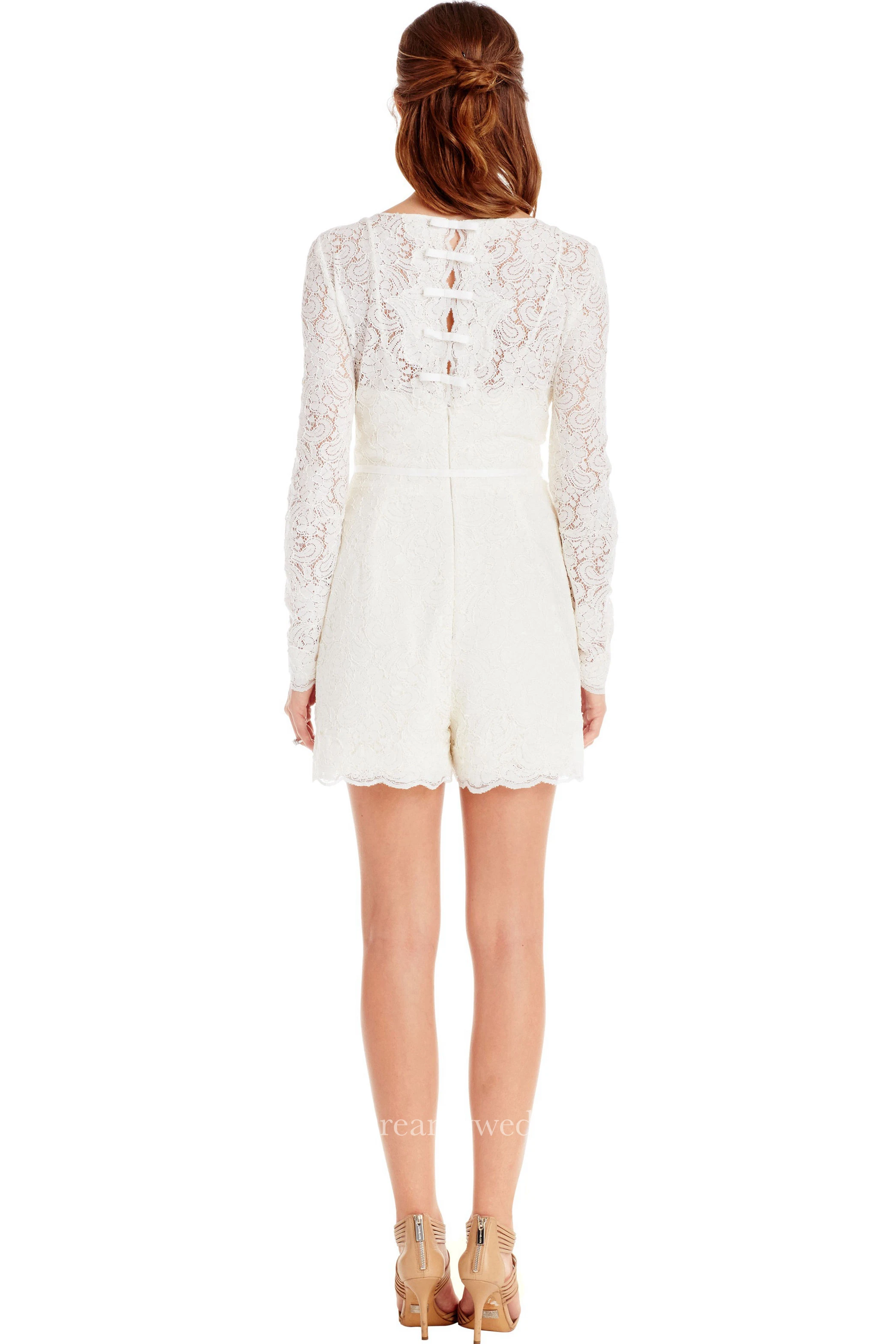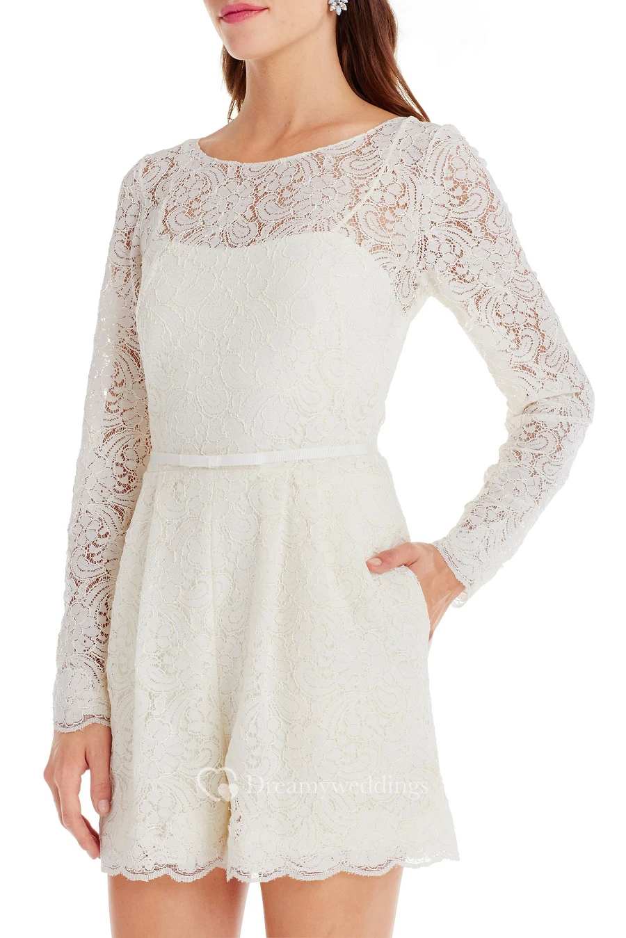 Long-Sleeve Scoop-Neck Knee-Length Lace Little White Dress