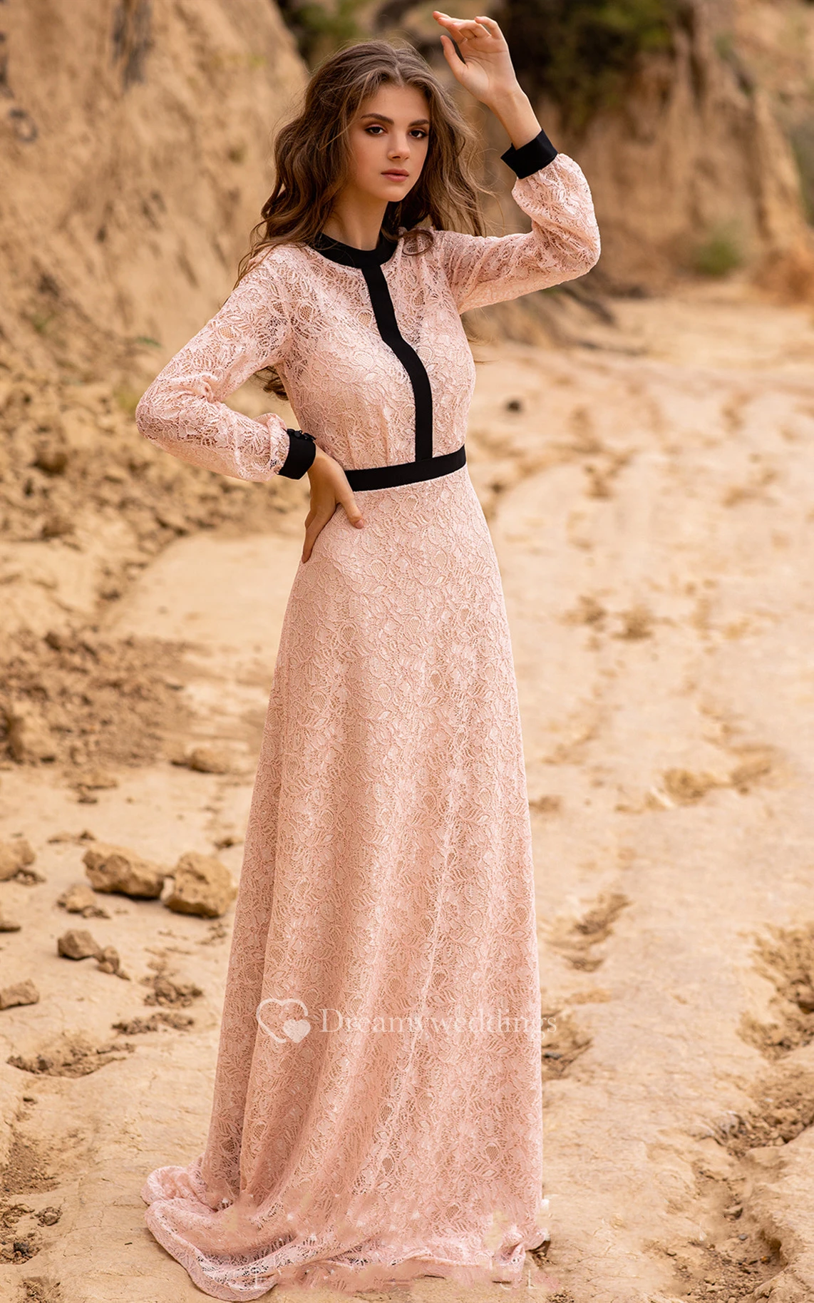 Long Sleeved A Line Modest Lace Evening Dress