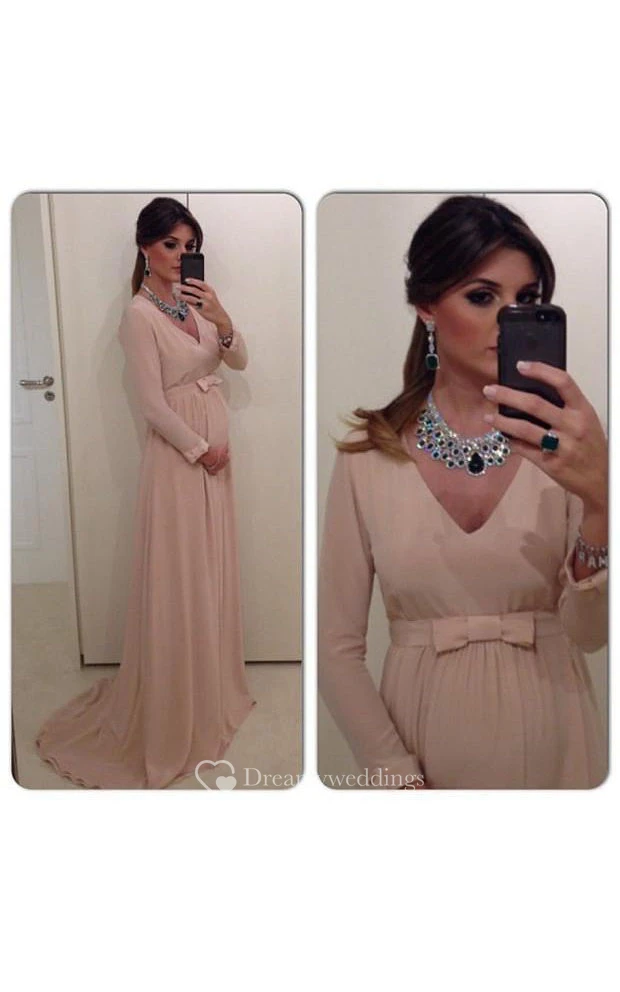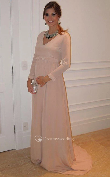 Long-sleeved V-neck A-line Chiffon Dress with Bow