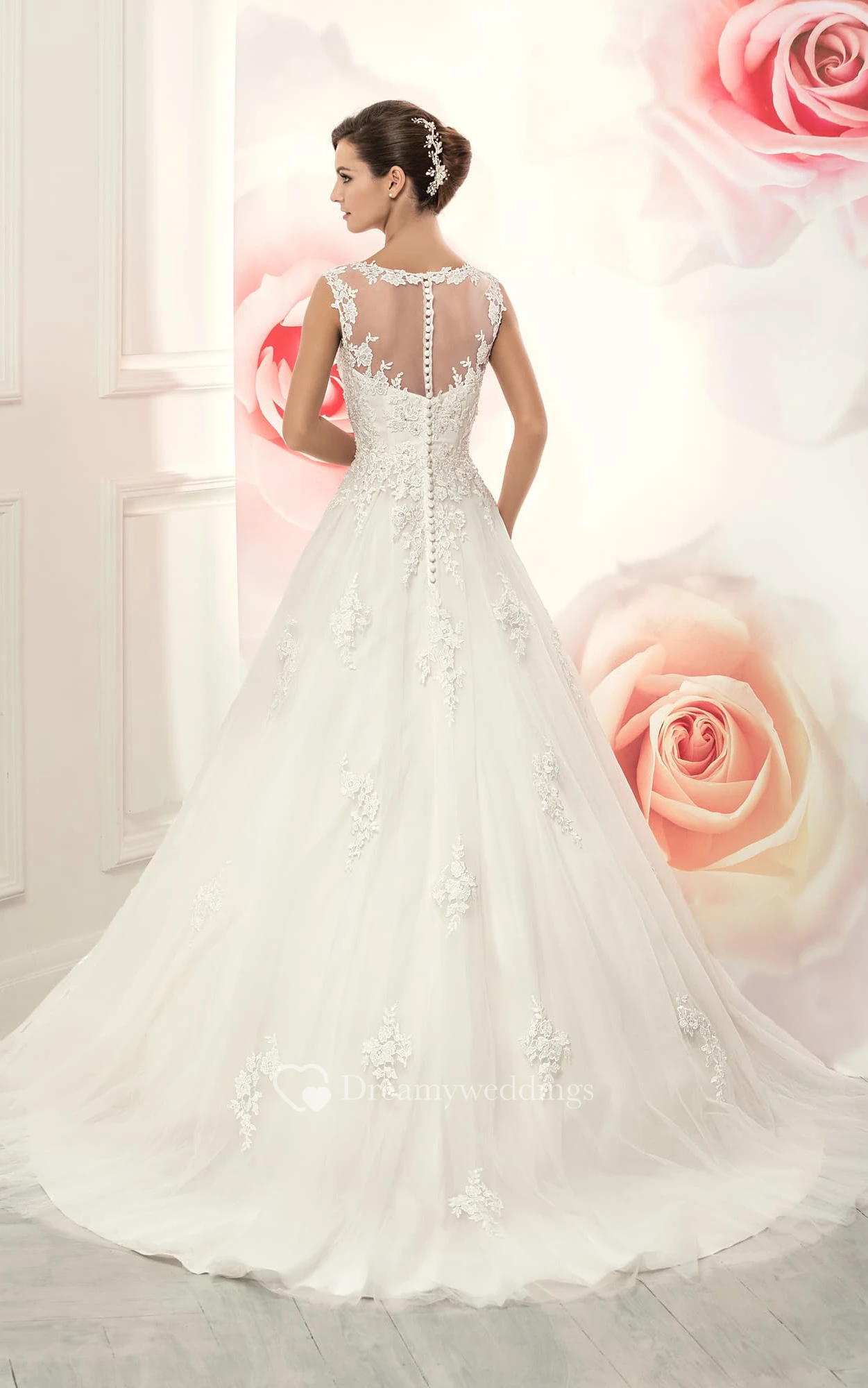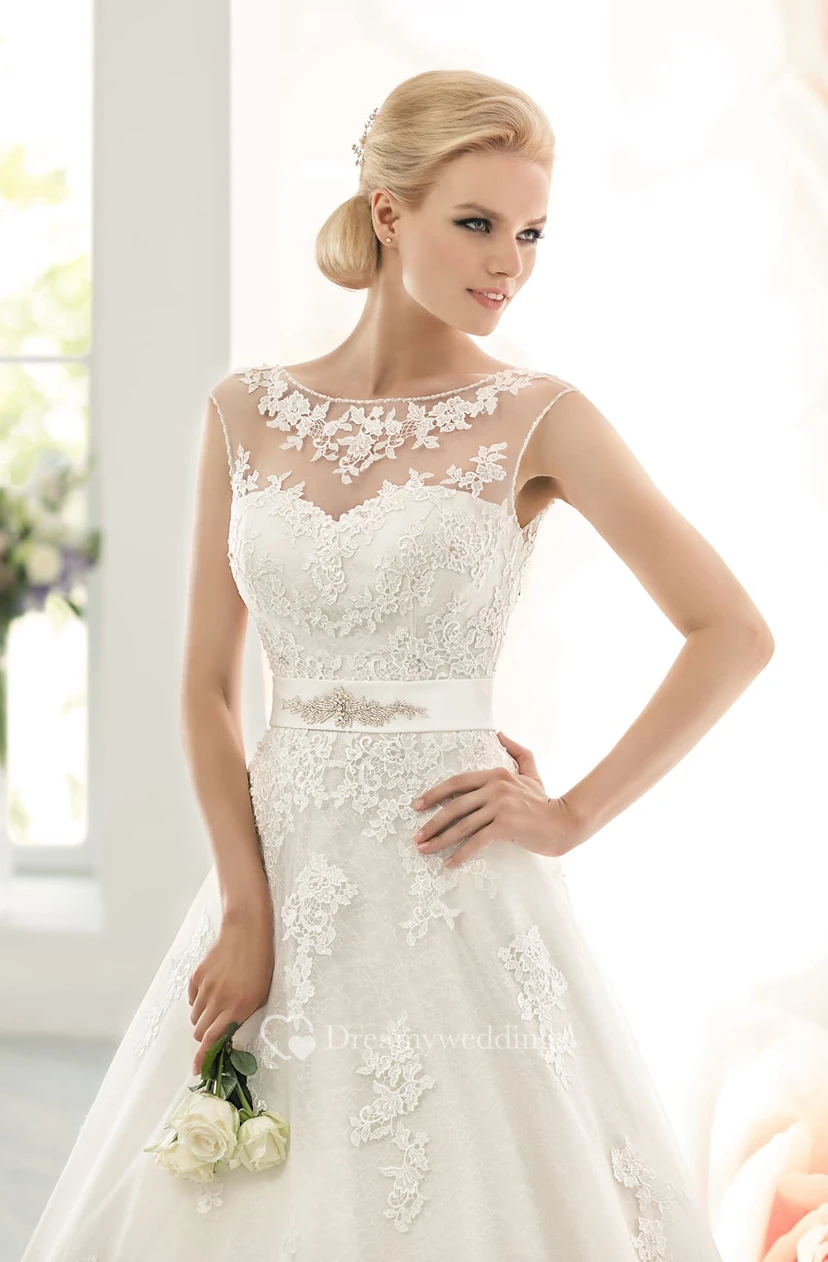 Long Sleeveless A-line Lace Wedding Dress With Beaded Sash