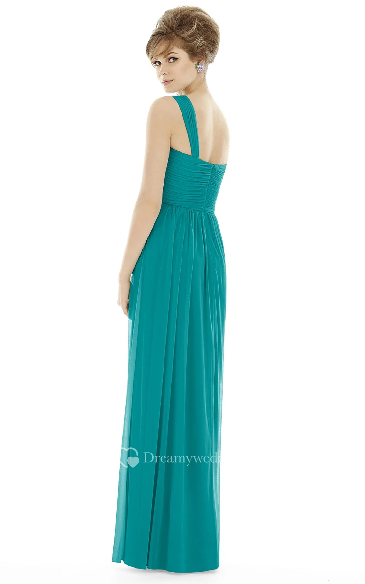 Long Sleeveless One-Shoulder Chiffon Dress with Strap-Back and Ruching