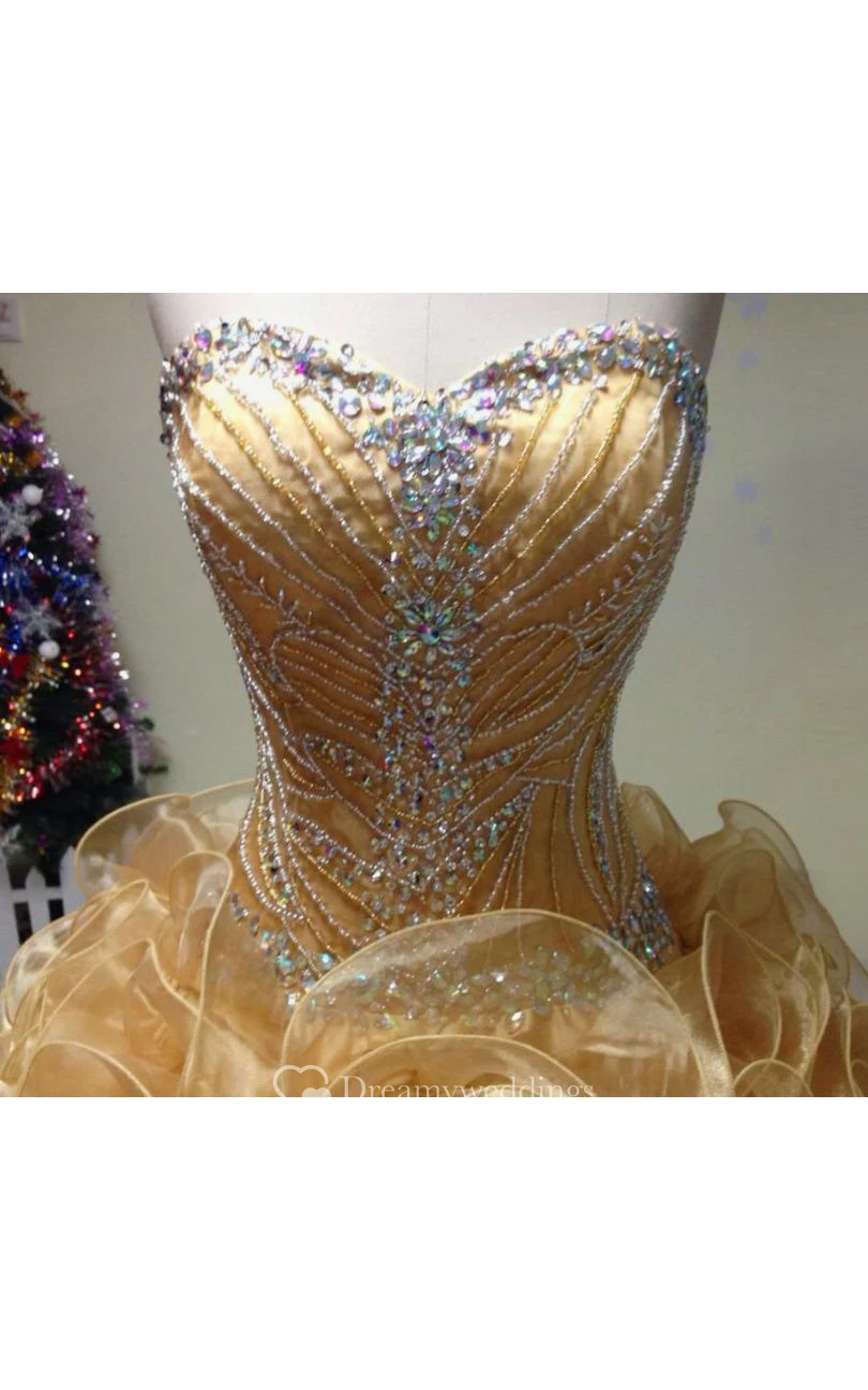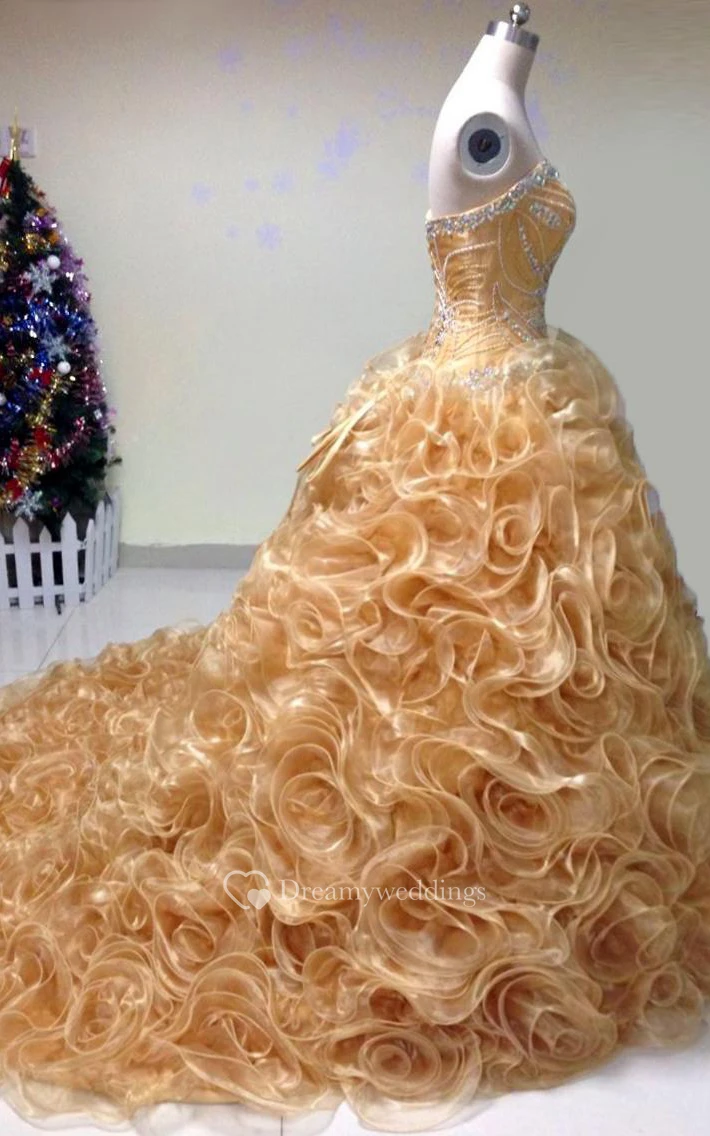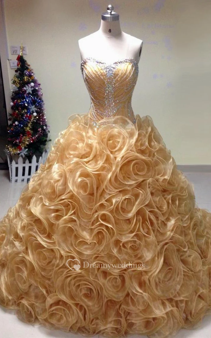 Long Sweetheart Beading Flower Brush Train Zipper Lace-Up Back Lace Organza Dress