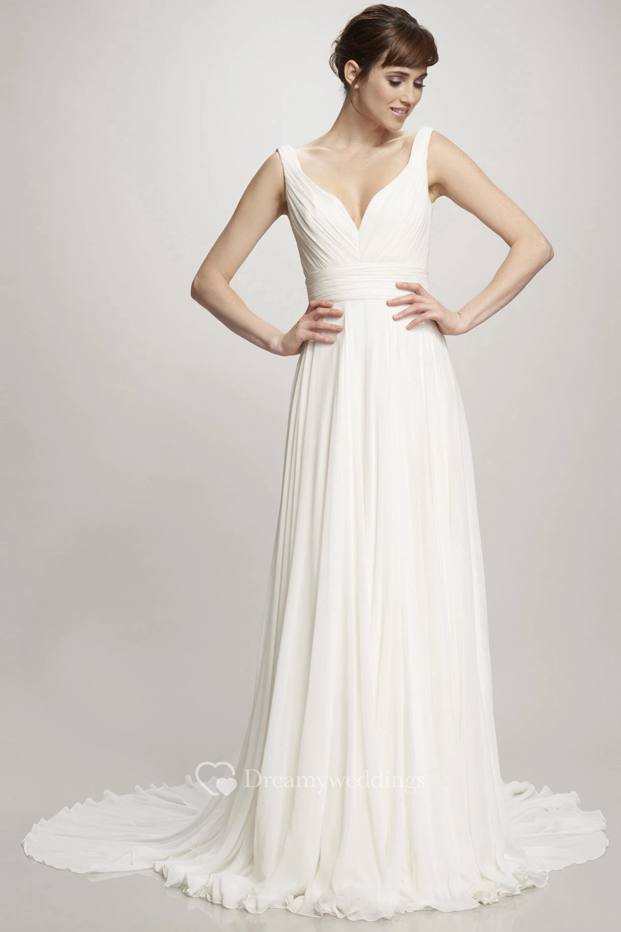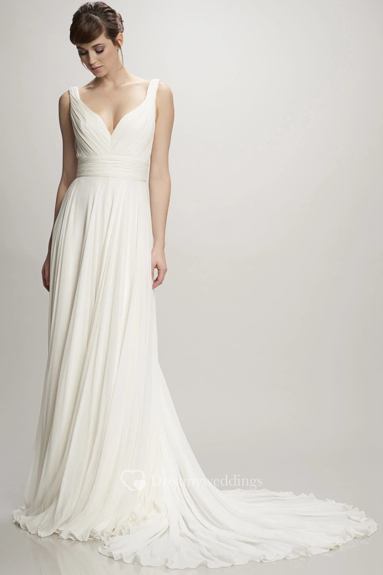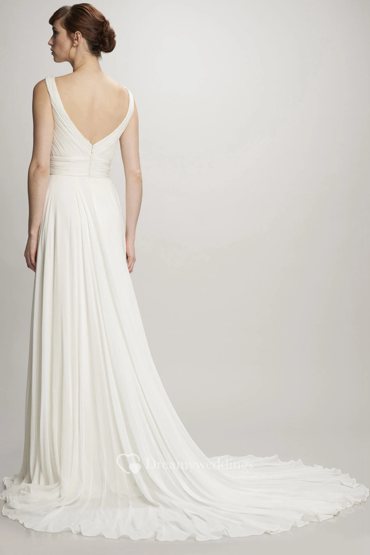 Long V-Neck Ruched Chiffon Wedding Dress With Court Train And V Back