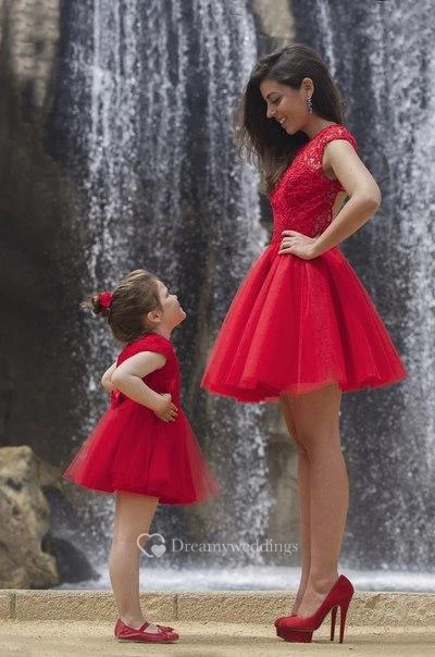 Lovely Red Lace Mother and Daughter Dress Tulle Short Cocktail Dress